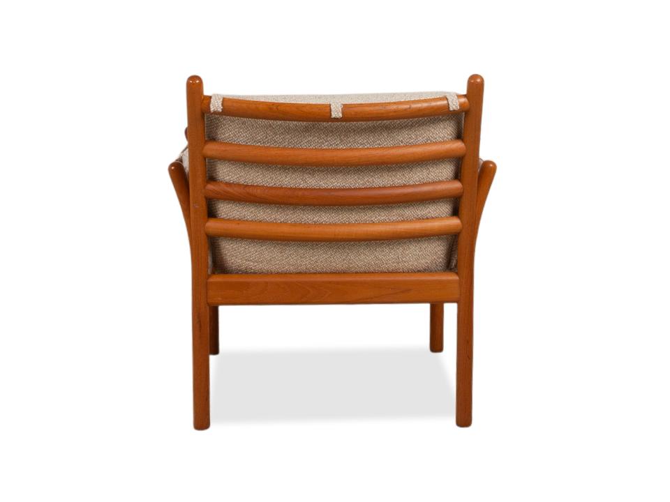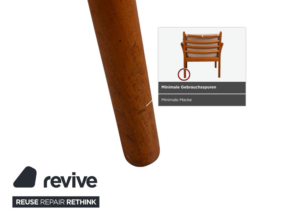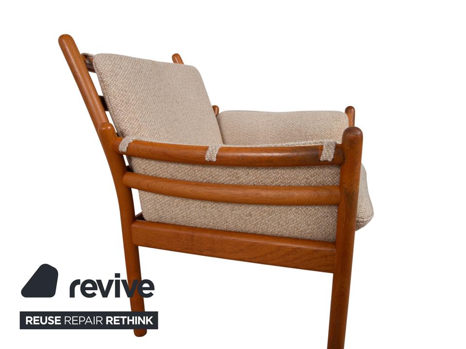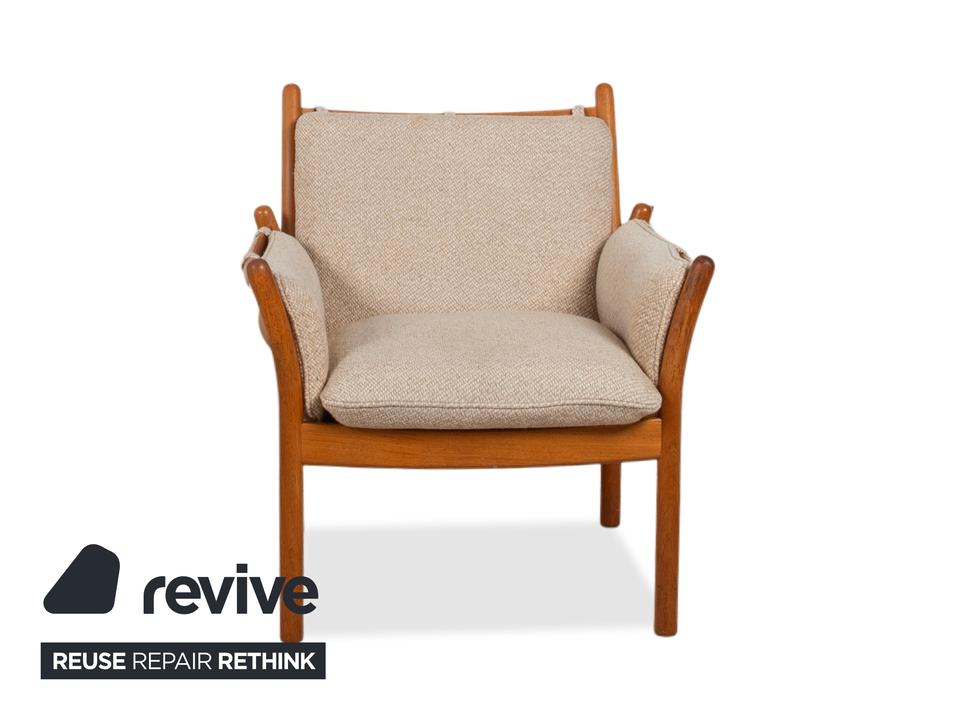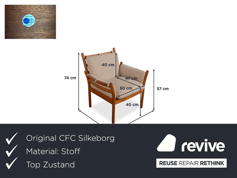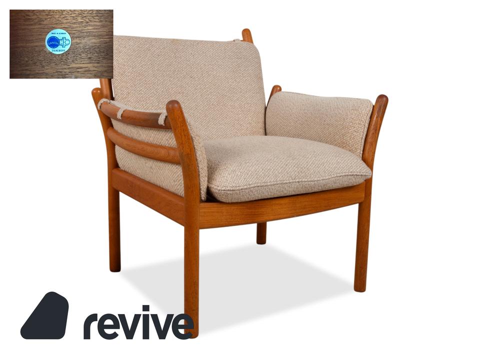 Mit diesem Sessel holst du dir ein wahres Meisterwerk des dänischen Designs in dein Zuhause. Der „Genius“ Sessel, entworfen von Illum Wikkelsø für CFC Silkeborg im Jahr 1975, ist ein Paradebeispiel für die Eleganz und handwerkliche Perfektion der Mid-Century-Ära. Uns begeistert besonders die fließende, fast schon organische Linienführung des massiven Teakholz-Gestells – die geschwungenen Armlehnen und die sichtbaren Holzverbindungen zeigen eindrucksvoll, warum dänisches Design weltweit so geschätzt wird.Das Gestell aus warmem Teakholz harmoniert perfekt mit dem hochwertigen grauen Stoffbezug (Pondus 5). Diese Kombination verleiht dem Sessel eine zeitlose Ruhe und sorgt dafür, dass er trotz seiner markanten Präsenz eine angenehme Leichtigkeit ausstrahlt. Die tiefe Sitzposition und die weich gepolsterten Kissen bieten genau den Komfort, den man von einem echten Wikkelsø-Entwurf erwartet – hier treffen Ergonomie und Ästhetik auf höchstem Niveau aufeinander.Die Verarbeitungsqualität ist absolut erstklassig und zeugt von der ehrlichen Handwerkskunst der 70er Jahre. Dieser Vintage-Klassiker ist nicht nur eine bequeme Sitzgelegenheit, sondern eine Wertanlage für jeden Liebhaber des skandinavischen Stils. Ein ehrliches Design-Original, das durch Charakter und Geschichte überzeugt.