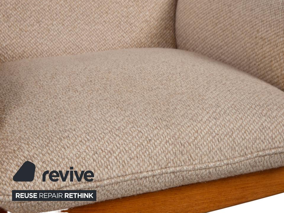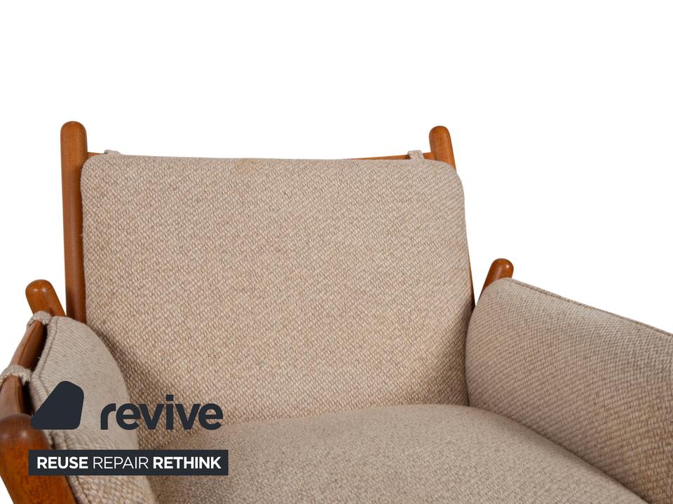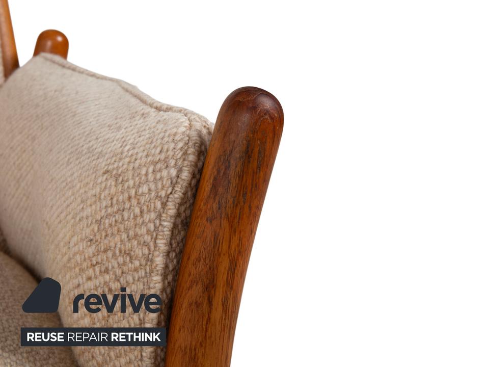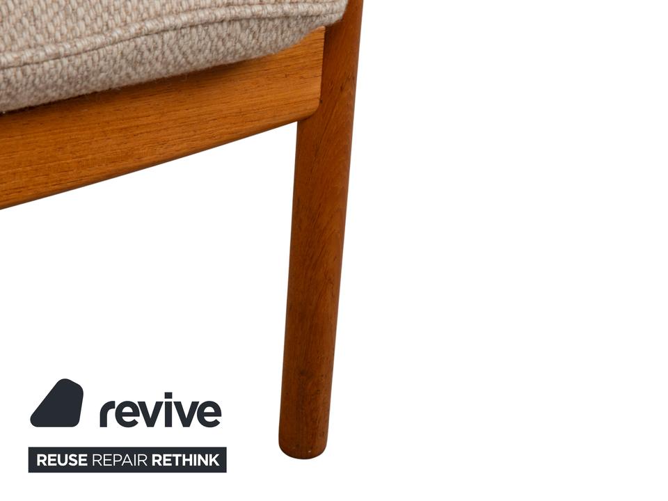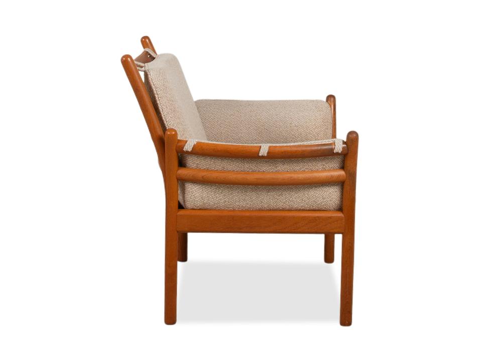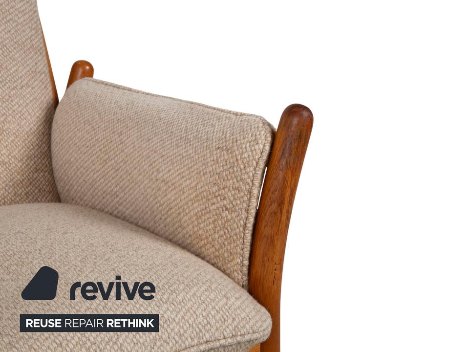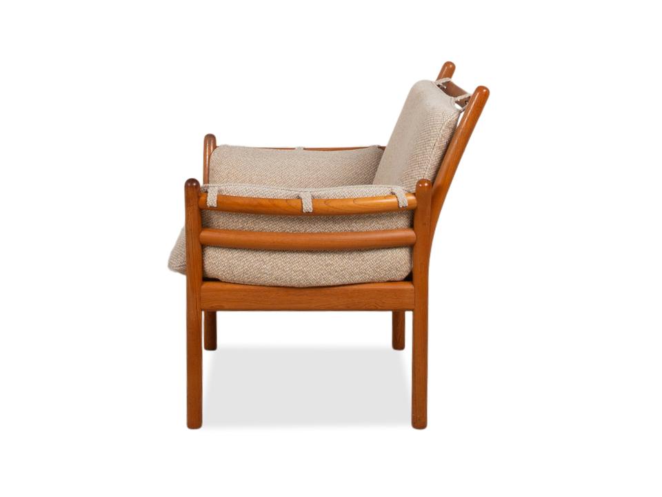 Mit diesem Sessel holst du dir ein wahres Meisterwerk des dänischen Designs in dein Zuhause. Der „Genius“ Sessel, entworfen von Illum Wikkelsø für CFC Silkeborg im Jahr 1975, ist ein Paradebeispiel für die Eleganz und handwerkliche Perfektion der Mid-Century-Ära. Uns begeistert besonders die fließende, fast schon organische Linienführung des massiven Teakholz-Gestells – die geschwungenen Armlehnen und die sichtbaren Holzverbindungen zeigen eindrucksvoll, warum dänisches Design weltweit so geschätzt wird.Das Gestell aus warmem Teakholz harmoniert perfekt mit dem hochwertigen grauen Stoffbezug (Pondus 5). Diese Kombination verleiht dem Sessel eine zeitlose Ruhe und sorgt dafür, dass er trotz seiner markanten Präsenz eine angenehme Leichtigkeit ausstrahlt. Die tiefe Sitzposition und die weich gepolsterten Kissen bieten genau den Komfort, den man von einem echten Wikkelsø-Entwurf erwartet – hier treffen Ergonomie und Ästhetik auf höchstem Niveau aufeinander.Die Verarbeitungsqualität ist absolut erstklassig und zeugt von der ehrlichen Handwerkskunst der 70er Jahre. Dieser Vintage-Klassiker ist nicht nur eine bequeme Sitzgelegenheit, sondern eine Wertanlage für jeden Liebhaber des skandinavischen Stils. Ein ehrliches Design-Original, das durch Charakter und Geschichte überzeugt.