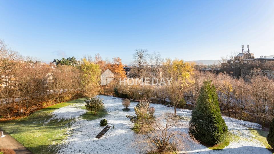 Der Wohnbereich bildet das Herz der Wohnung. Hier haben Sie genügend Platz für eine gemütliche Sofaecke und einen Essbereich, in dem Sie allein oder zu zweit entspannt den Tag ausklingen lassen können. Durch die Lage im vierten Obergeschoss wirkt der Raum angenehm hell, Sie blicken über die umliegenden Häuser und ins Grüne der gepflegten Außenanlagen.
