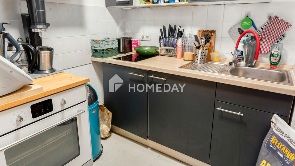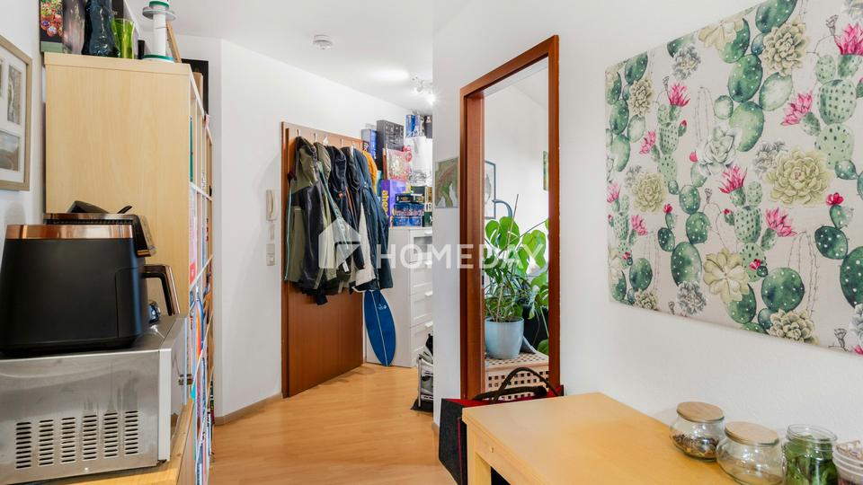 Die separate Küche mit Einbauküche nutzt die vorhandene Fläche optimal. Hier können Sie kochen, ohne dass sich Gerüche direkt im Wohnbereich ausbreiten. Das Bad mit Dusche ist funktional gestaltet und durch den Fliesenbelag gut zu reinigen, was sowohl Bewohnern als auch Vermietern entgegenkommt.