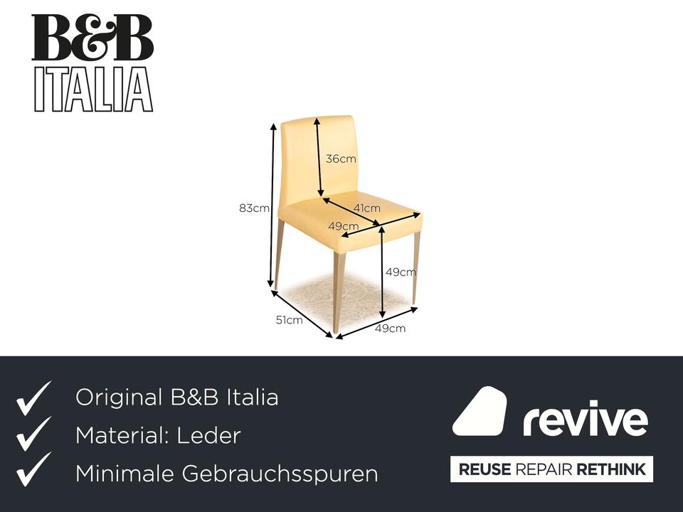 Die Stuhl Garnitur von B&B Italia ist mit einem cremefarbenen Echtleder bezogen und steht auf schmalen Metallfüßen. Er zeichnet sich durch das klassische Design und die schlichte, zeitlose Optik aus. Die Garnitur besteht aus vier Stühlen.