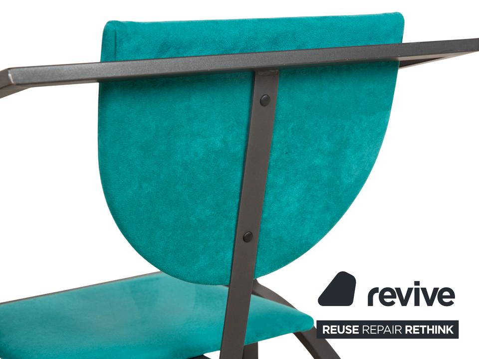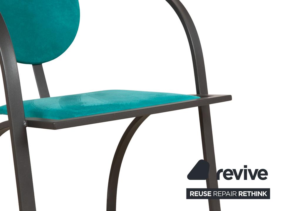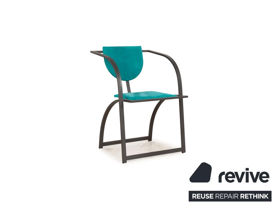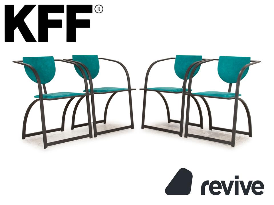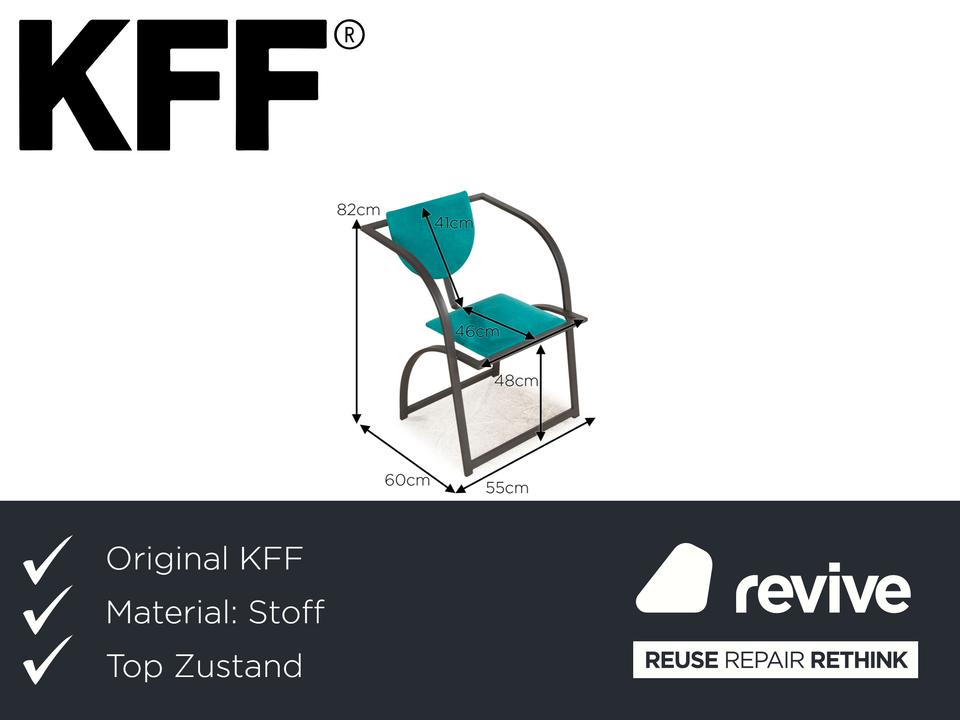 Die Cosinus Stuhl Garnitur von KFF ist mit einem blauen Stoff bezogen und steht auf einem schwarzen Metallgestell.
