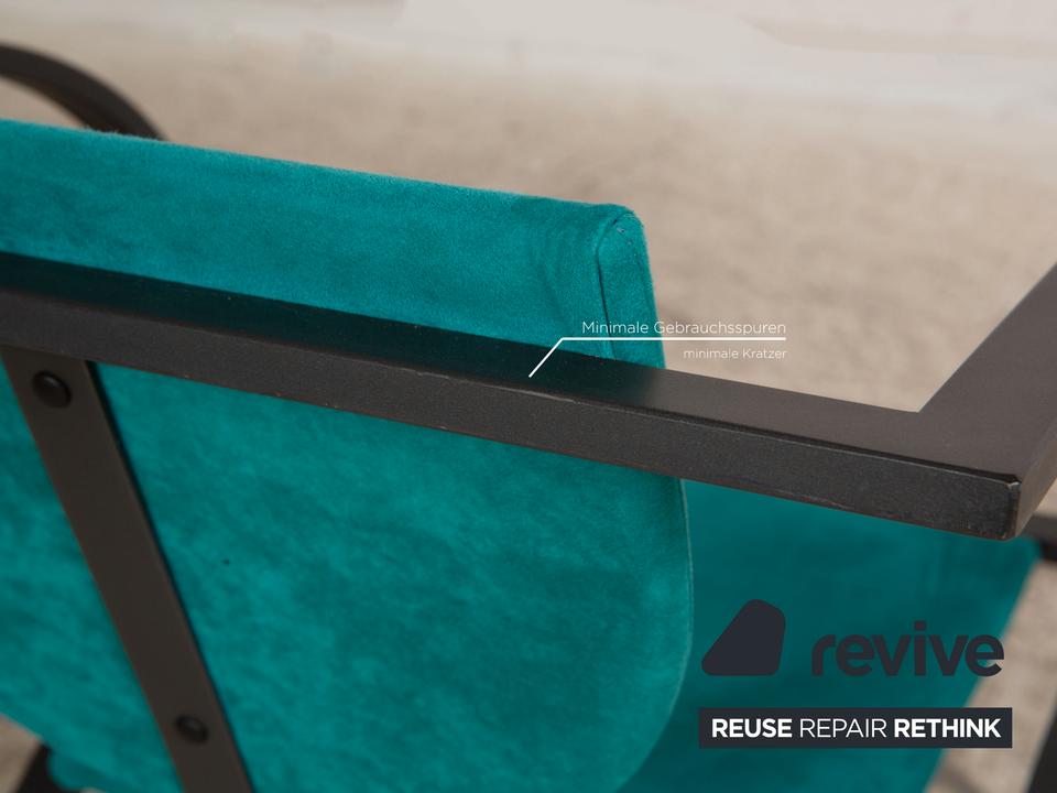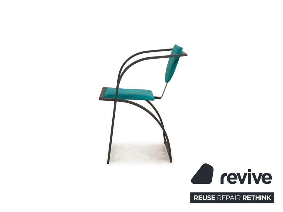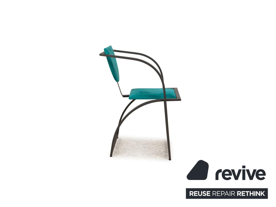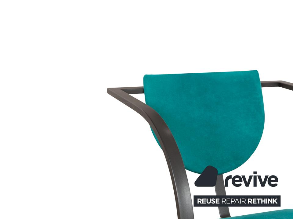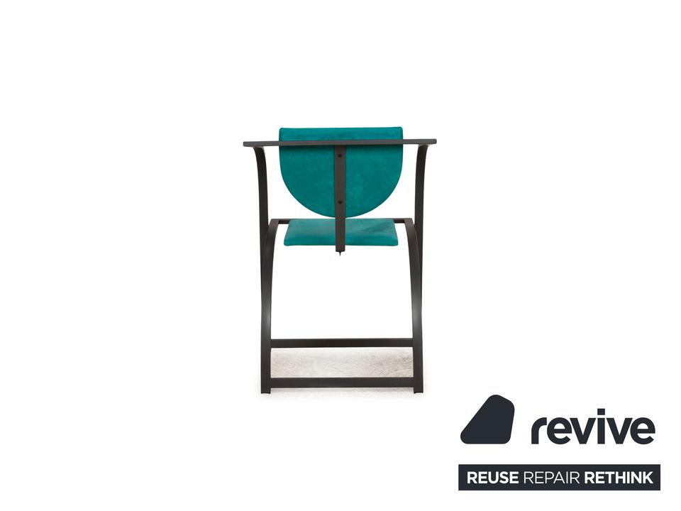 Die Cosinus Stuhl Garnitur von KFF ist mit einem blauen Stoff bezogen und steht auf einem schwarzen Metallgestell.