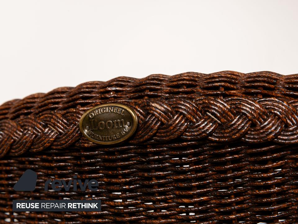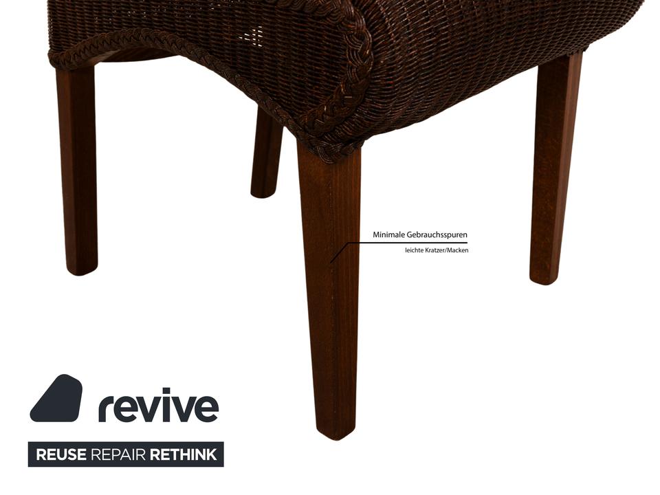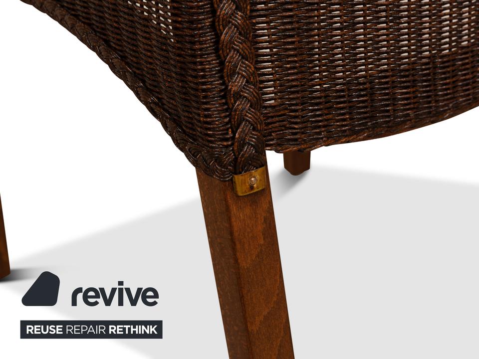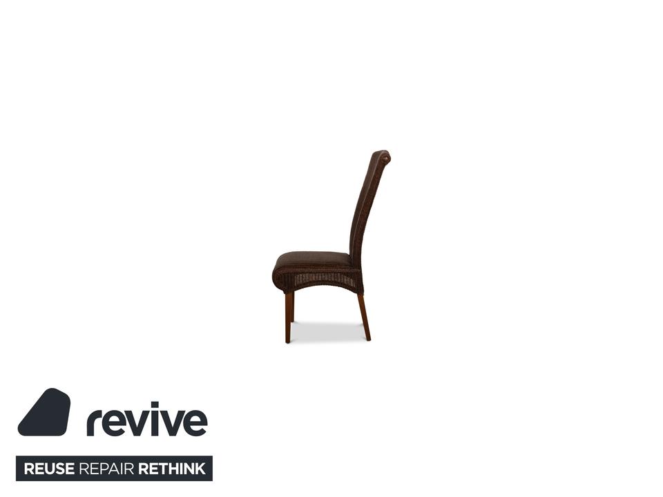 Die Esszimmer-Stuhl-Garnitur von Lloyd Loom überzeugt durch sein klassisches Design. Sie verbindet die in Dunkelbraun gehaltenen Naturmaterialien Holz und Korb auf gelungene Weise.