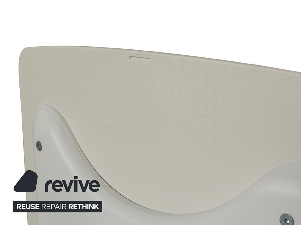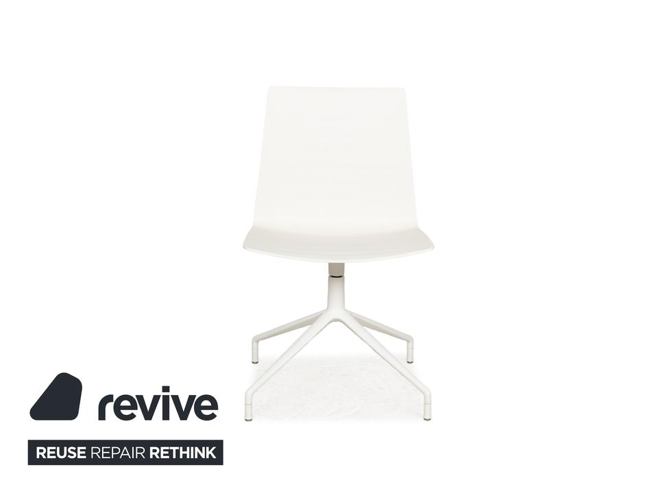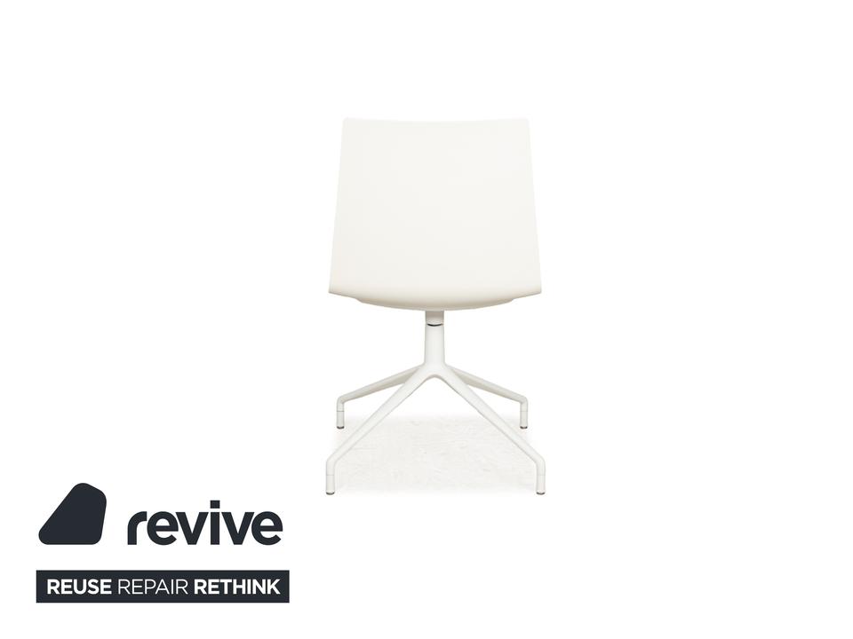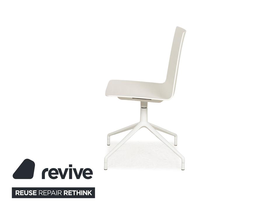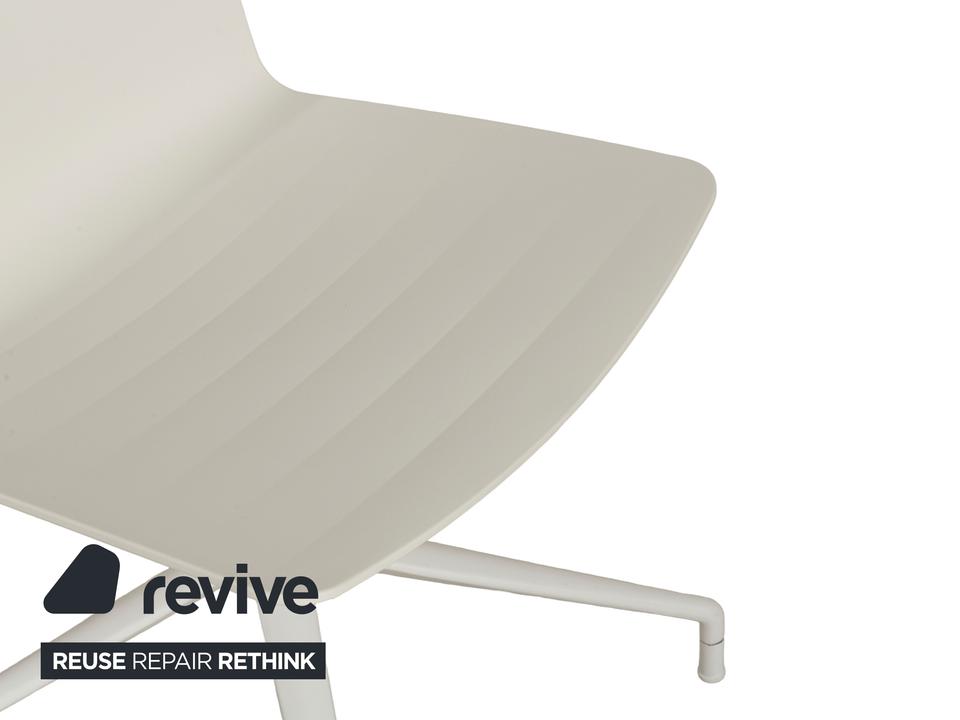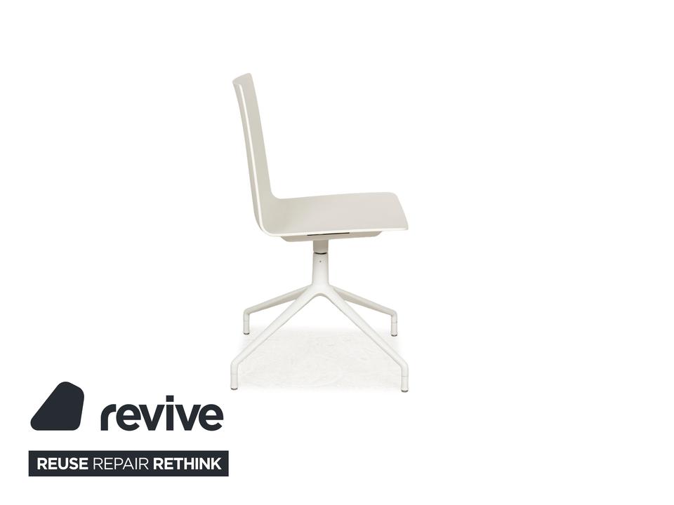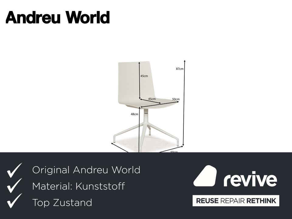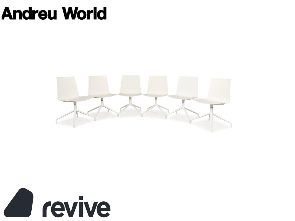 Die Stuhl-Garnitur von Andreau World, bestehend aus sechs baugleichen Exemplaren, überzeugt durch ihr modernes und schlichtes Design. Die Drehstühle sind komplett in creme-weiß gehalten und die ergonomisch geformten Sitzschalen sind auf einem Metallgestell in mattem Weiß montiert.