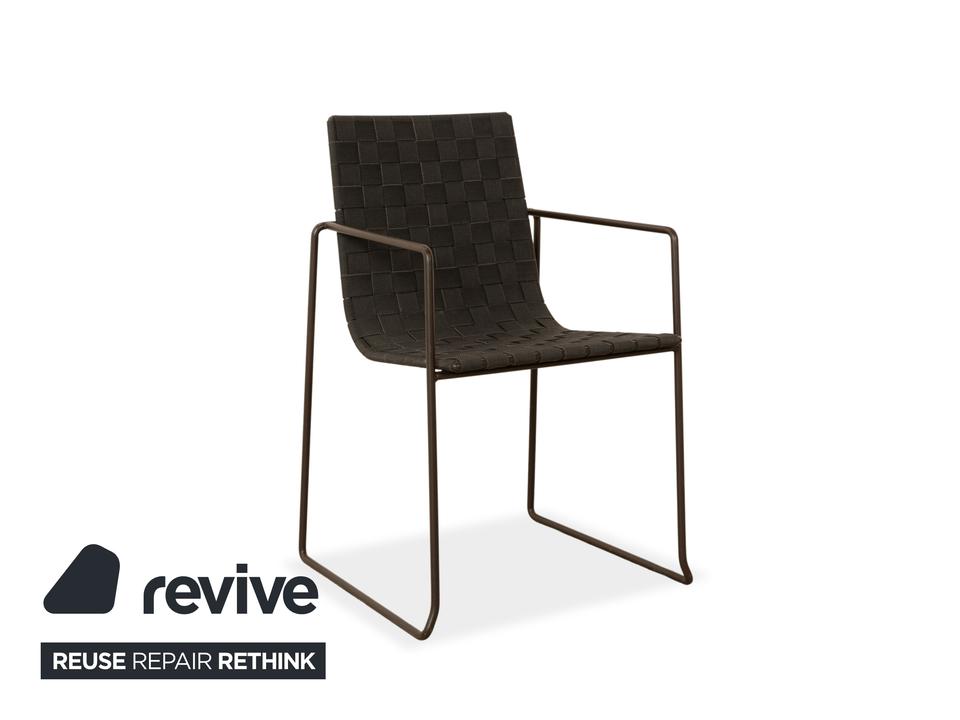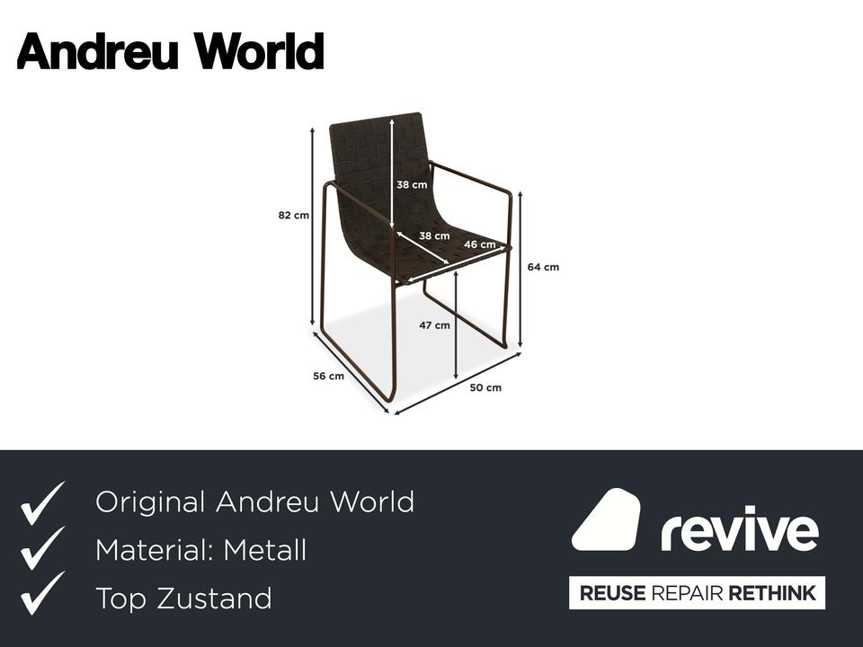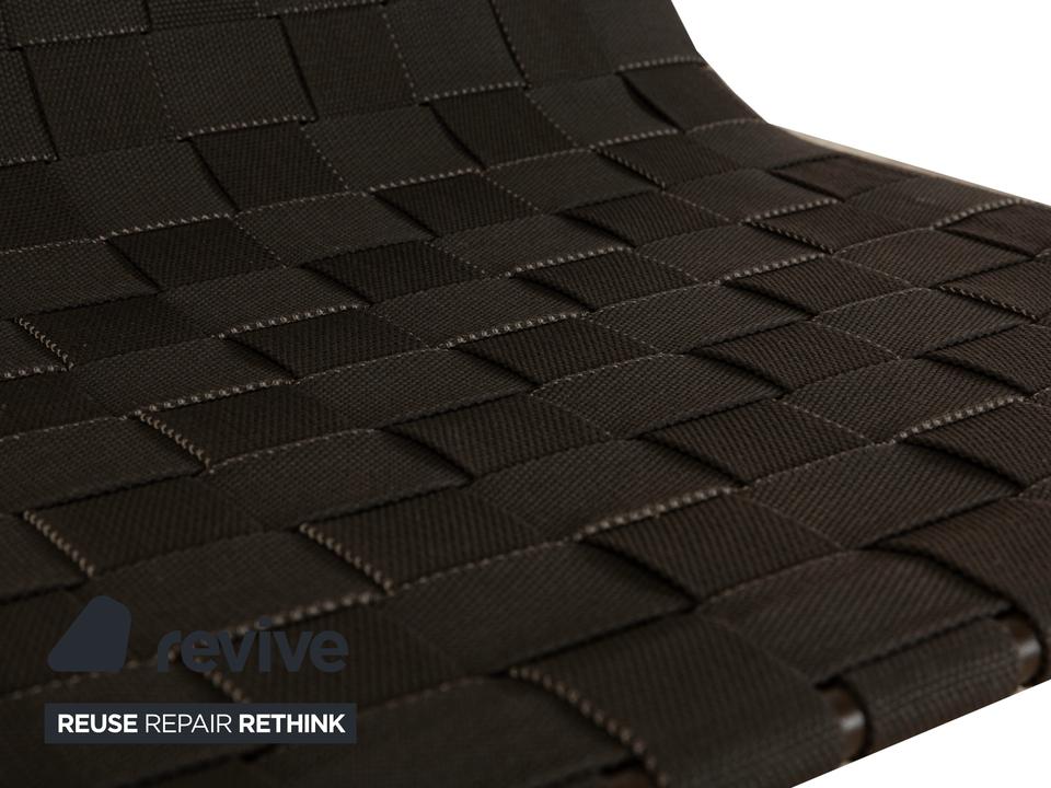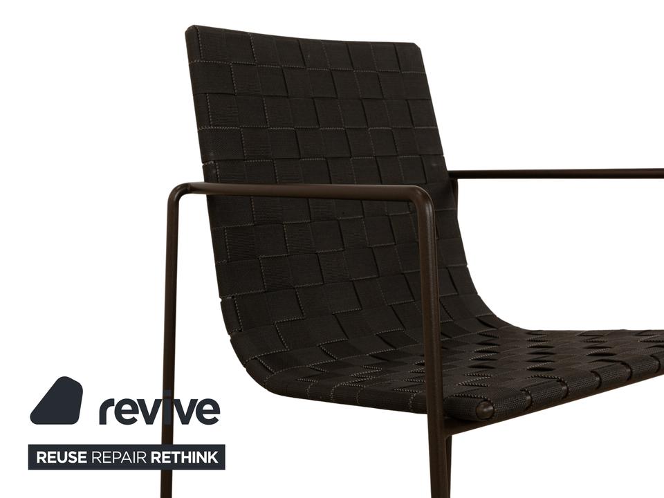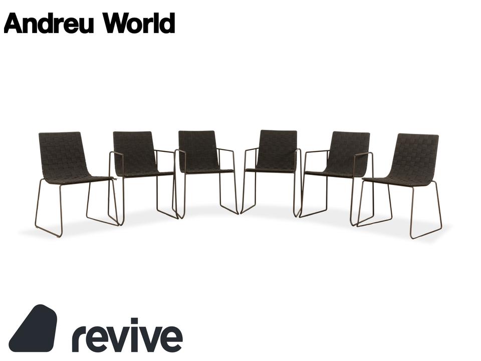 Die 6er Garnitur von Andreu World Trenza besteht aus vier Stühlen mit und 2 Stühlen ohne Armlehnen. Der Look der Stühle vereint minimalistisches Design mit hohem Sitzkomfort. Die Sitz- und Rückenfläche besteht aus robustem, schwarzem Bandgeflecht.