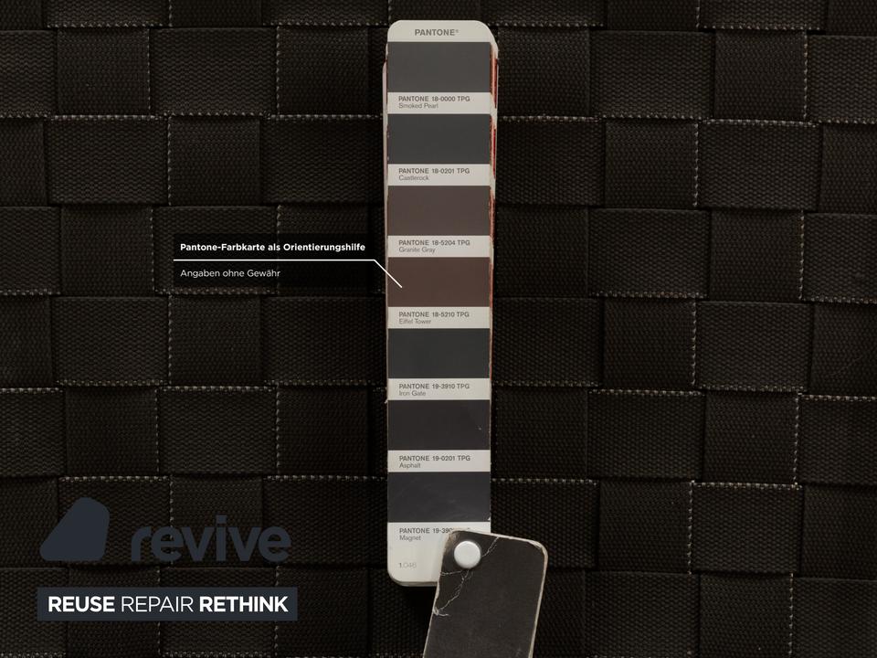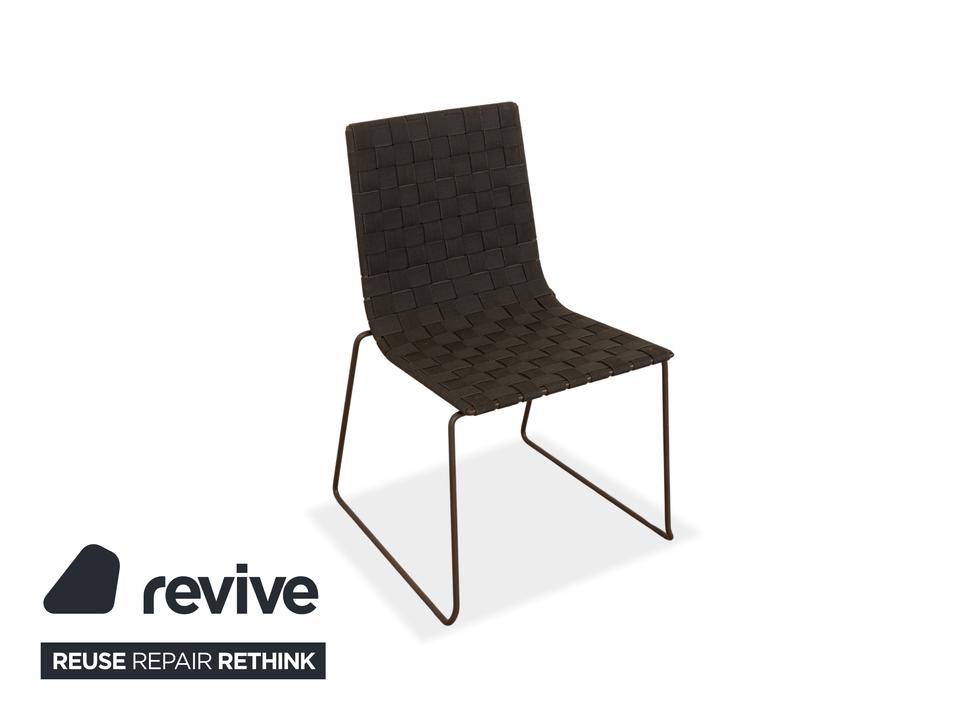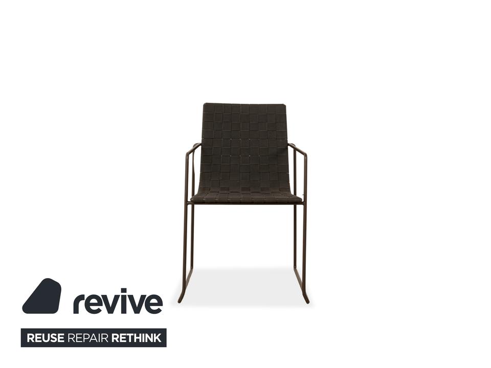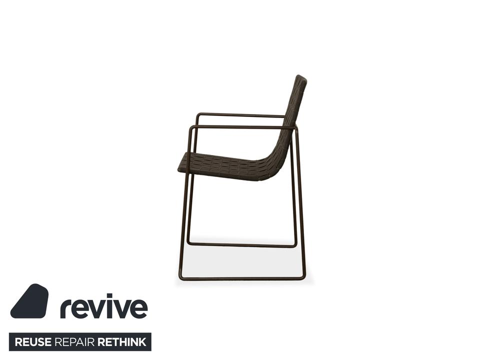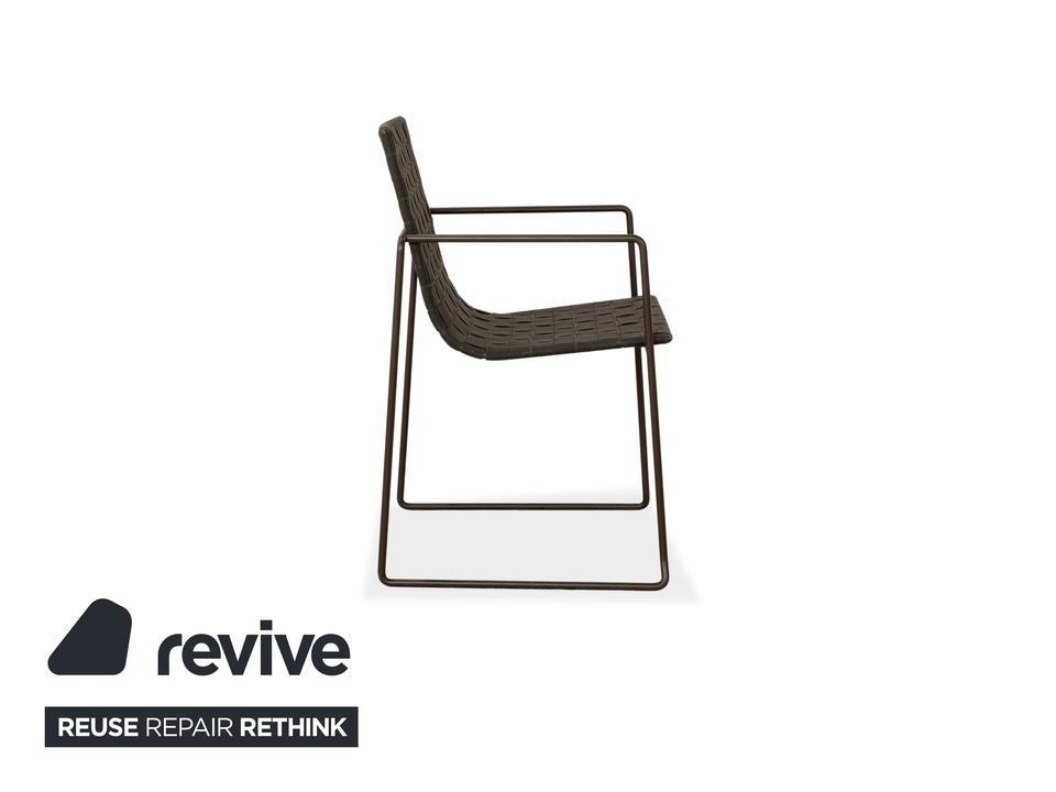 Die 6er Garnitur von Andreu World Trenza besteht aus vier Stühlen mit und 2 Stühlen ohne Armlehnen. Der Look der Stühle vereint minimalistisches Design mit hohem Sitzkomfort. Die Sitz- und Rückenfläche besteht aus robustem, schwarzem Bandgeflecht.
