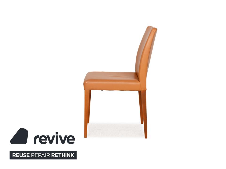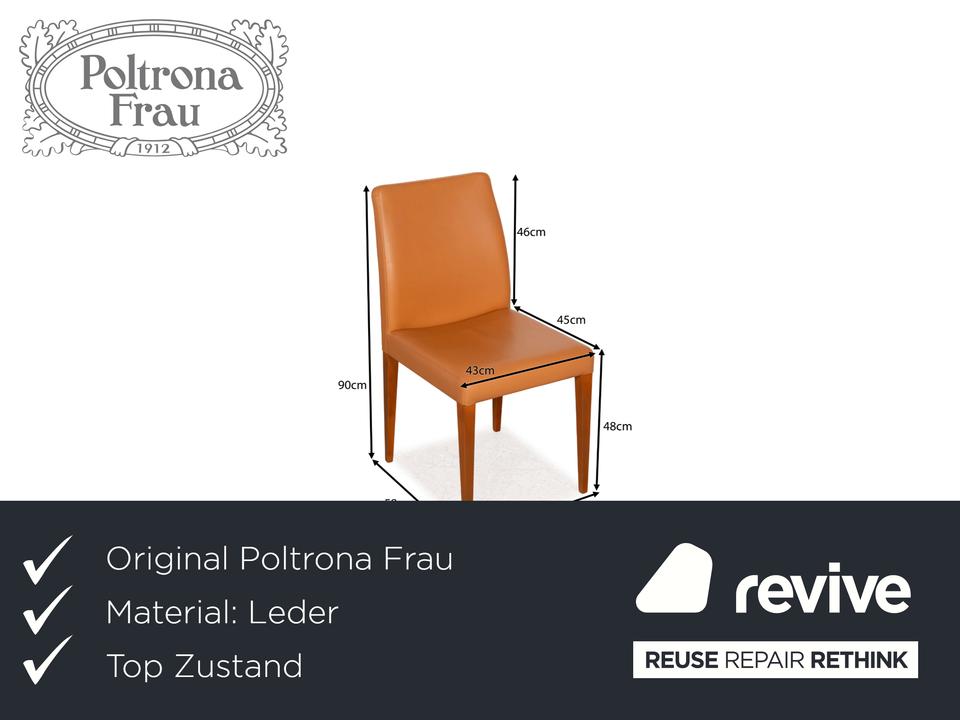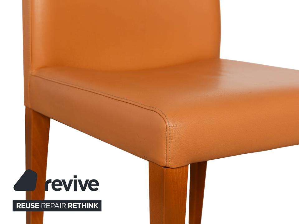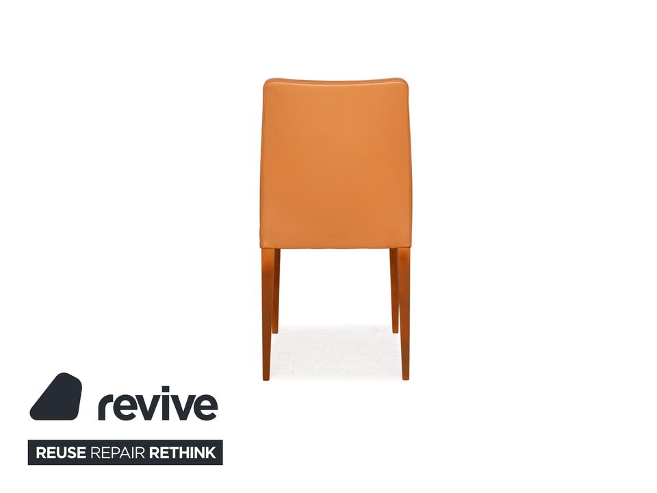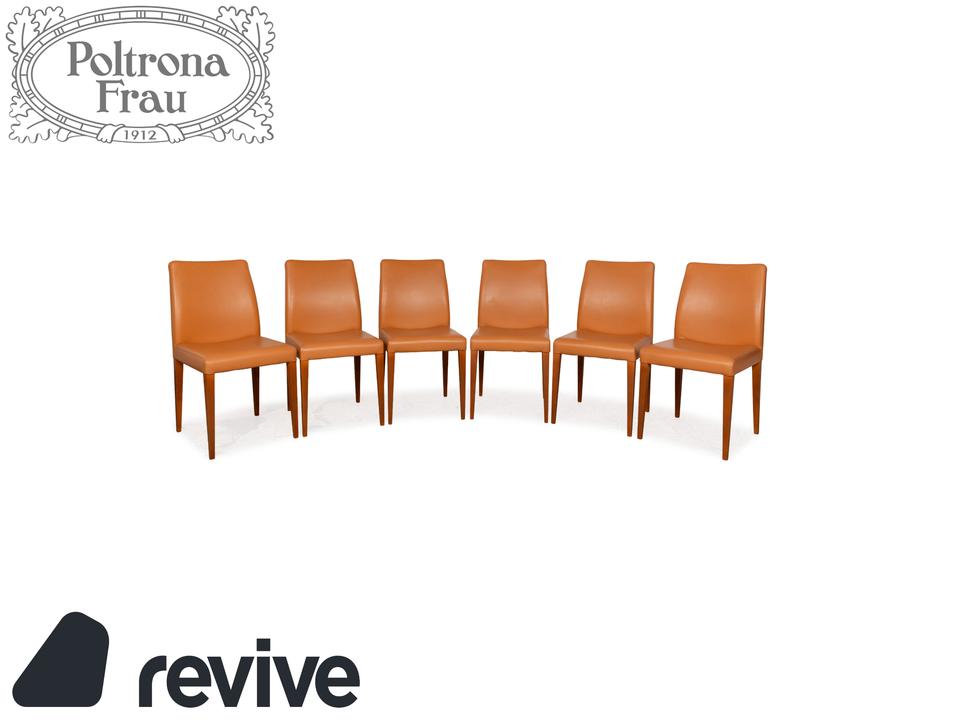Das Stuhl-Set von Poltrona Frau besteht aus insgesamt sechs gleichen Stühlen mit einem orange-beigefarbenen Lederbezug. Die Beine sind aus Holz in einem ähnlichen Farbton gefertigt, so dass ein harmonischer Gesamteindruck entsteht.