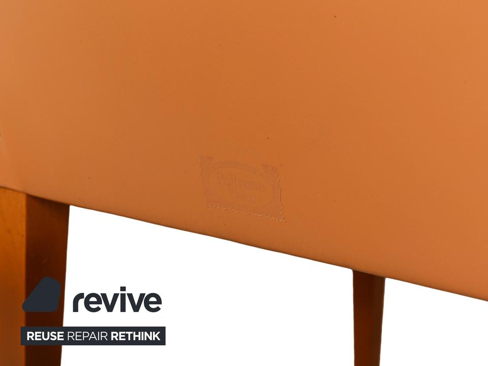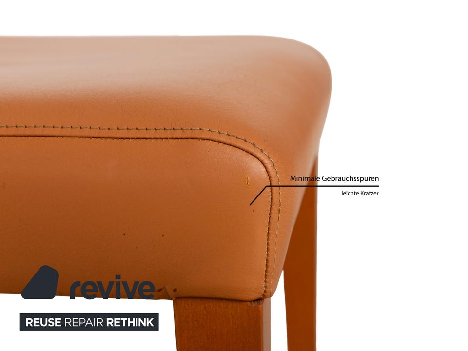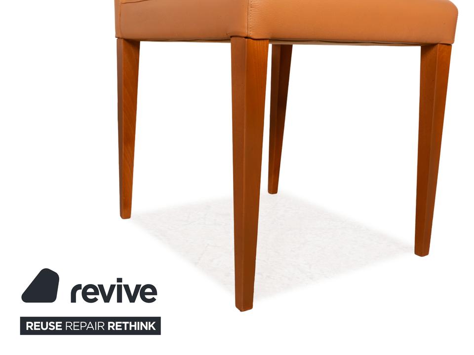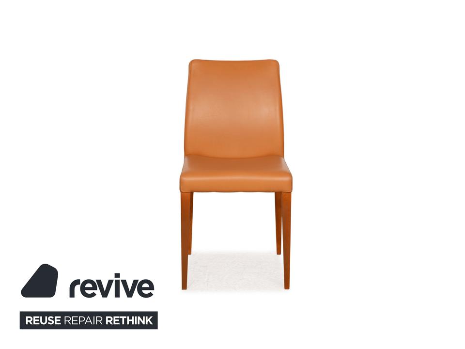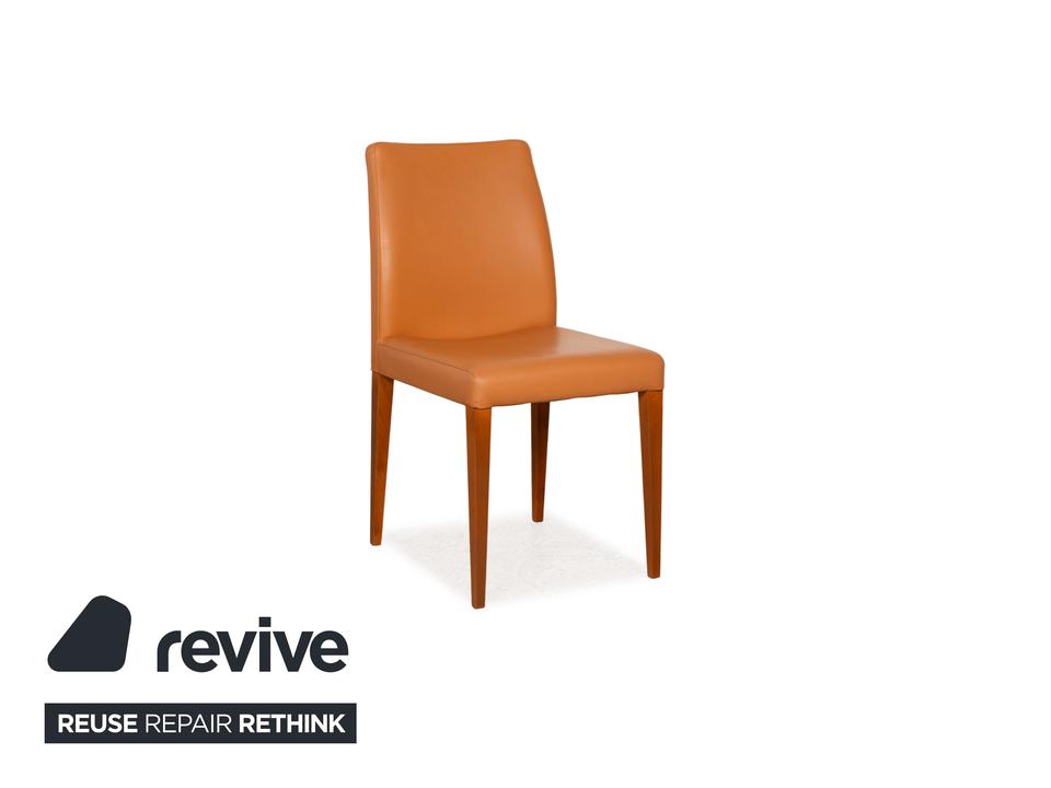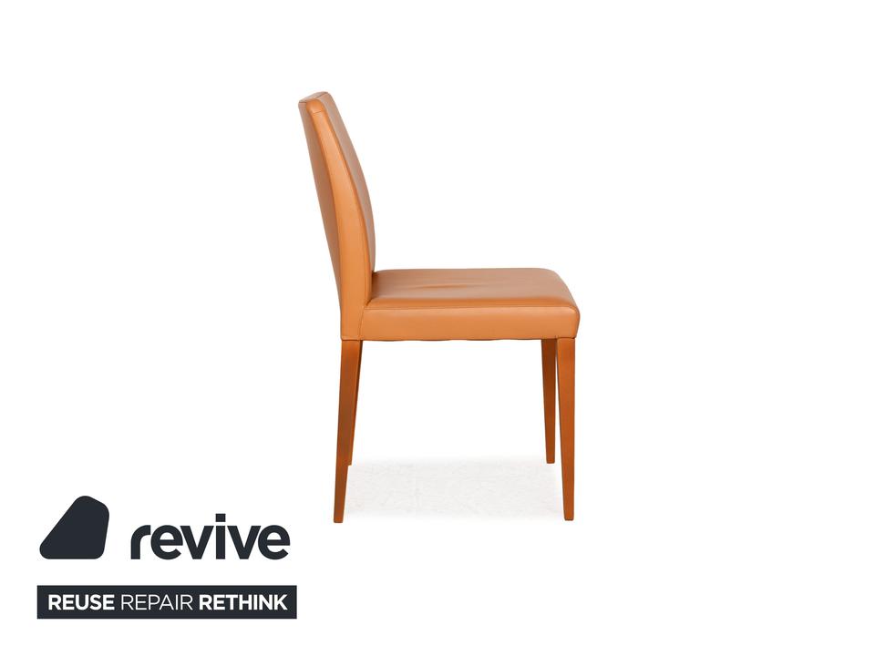 Das Stuhl-Set von Poltrona Frau besteht aus insgesamt sechs gleichen Stühlen mit einem orange-beigefarbenen Lederbezug. Die Beine sind aus Holz in einem ähnlichen Farbton gefertigt, so dass ein harmonischer Gesamteindruck entsteht.