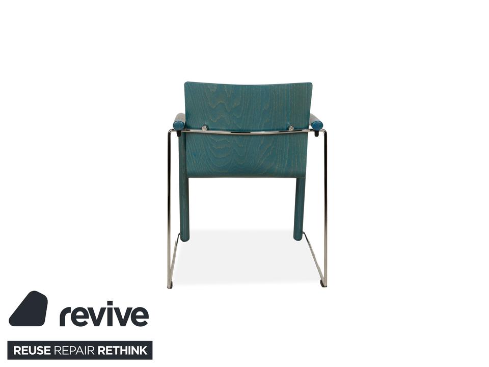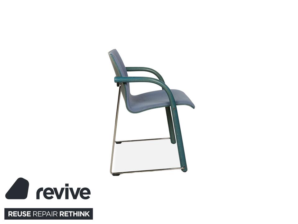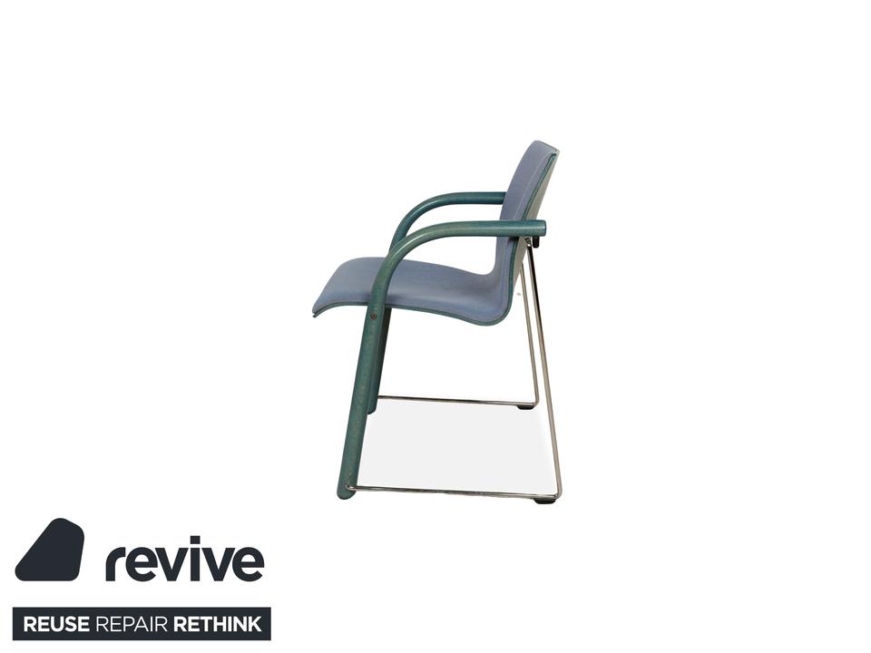Diese Stühle überzeugen mit klarer Formensprache und praktischer Funktionalität. Die blauen Sitzschalen in Kombination mit den geschwungenen, grün-metallischen Armlehnen und Kufengestellen sorgen für einen modernen Look – ideal für Konferenzräume, Wartebereiche oder kreative Workspaces. Stapelbar und pflegeleicht – perfekt für den flexiblen Einsatz.