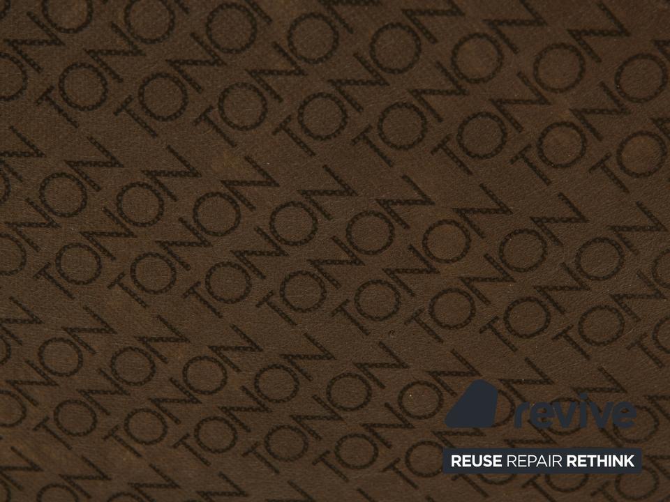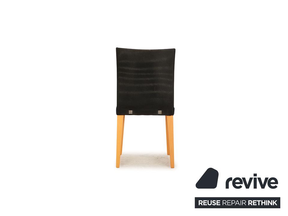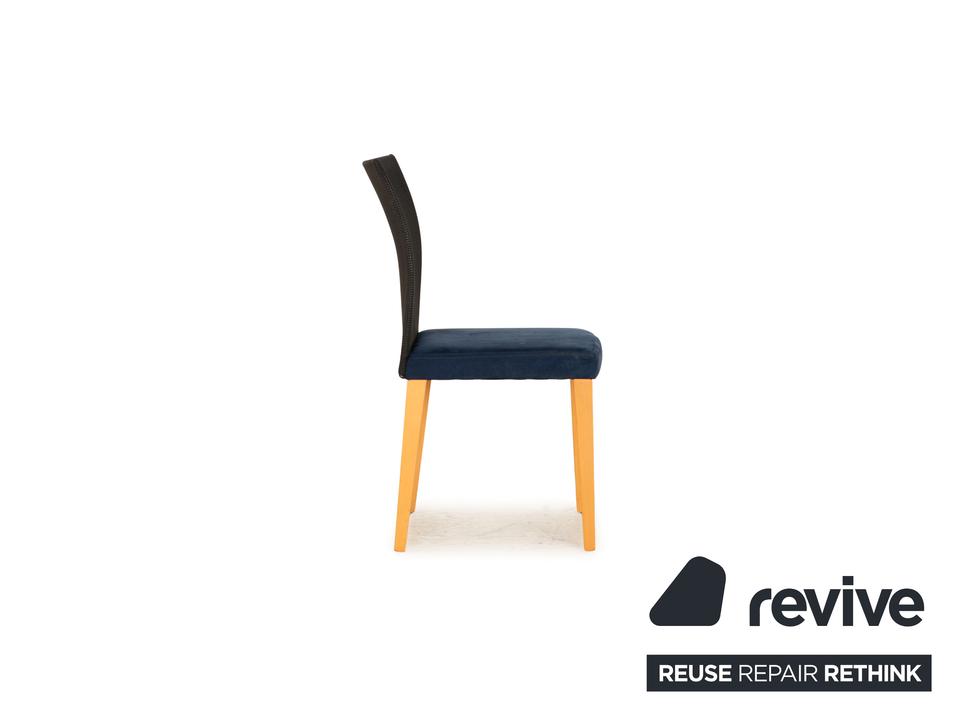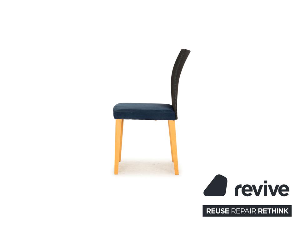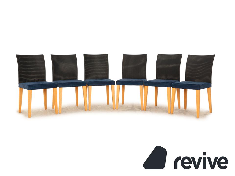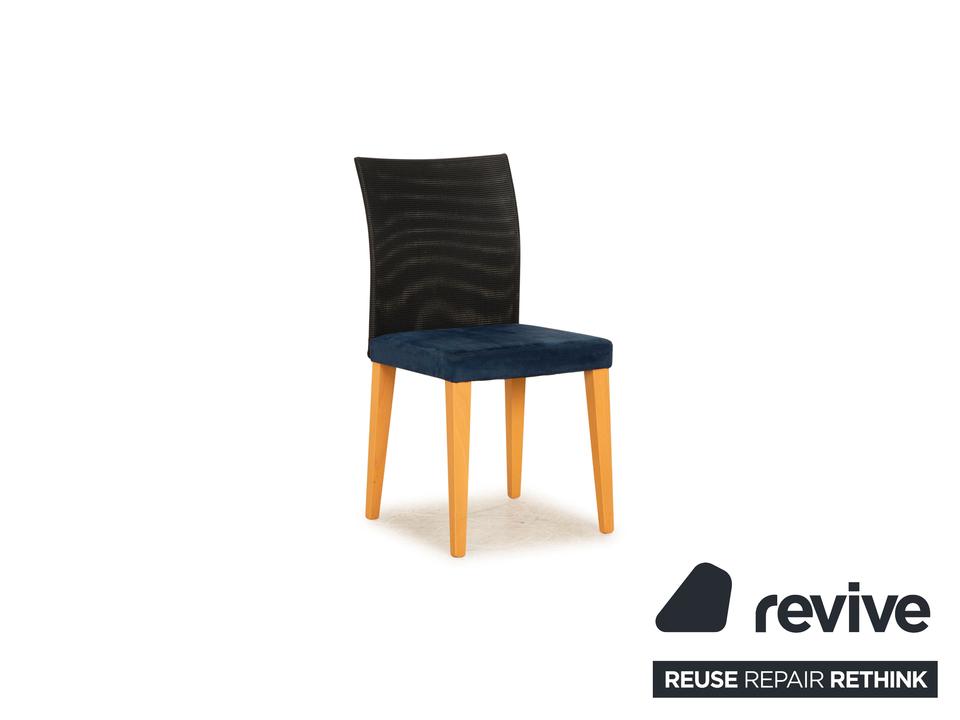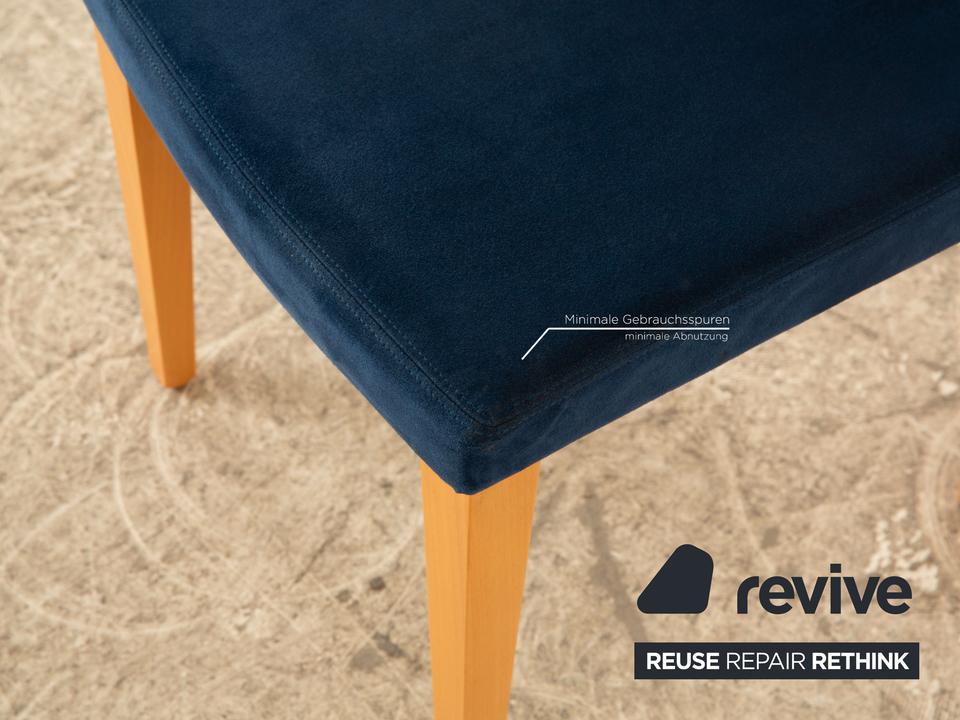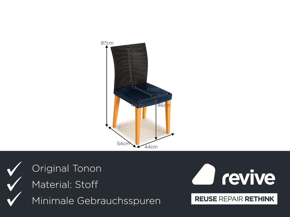 Die Tonon Stuhl Garnitur ist mit einem blauen Stoff bezogen und steht auf Holzfüßen.