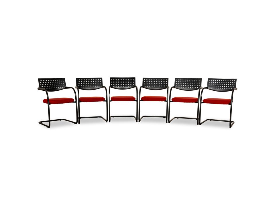Diese Garnitur Visavis Stühle von Vitra bestehend aus 6 Stühlen. Die Kombination aus dem schwarzen Gestell mit der roten Sitzfläche bietet einen hervorragenden Akzent. Zudem bringt die hohe Qualität der Stühle Stabilität, Komfort und selbstverständlich Langlebigkeit mit sich.