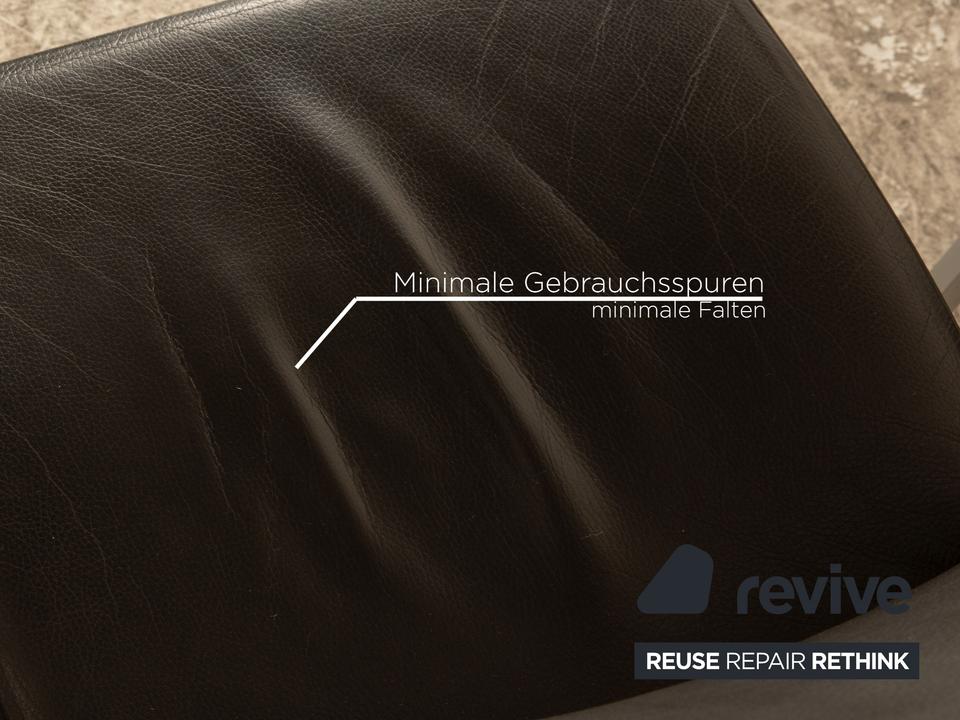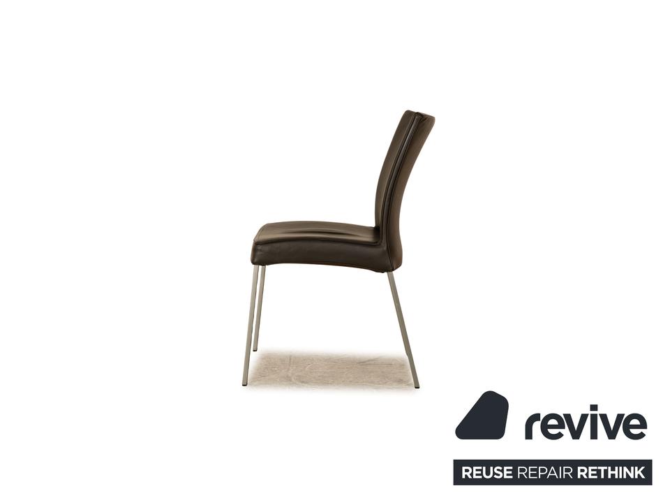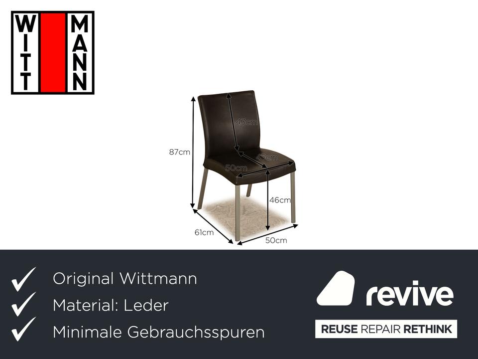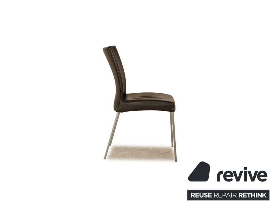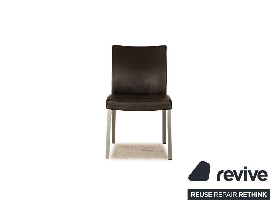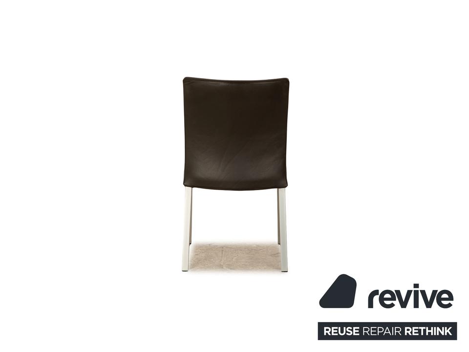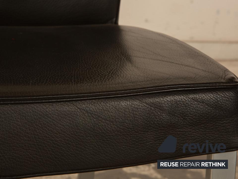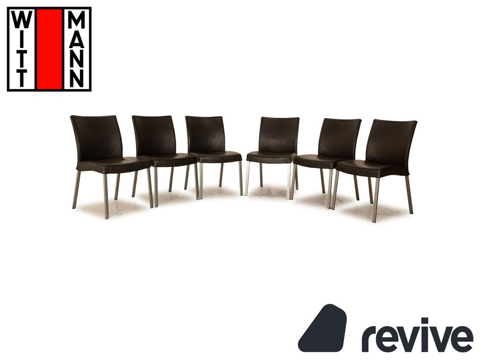 Die Stuhl Garnitur Times von Wittmann ist mit einem schwarzen Echtleder bezogen und steht auf schmalen Metallfüßen. Sie zeichnet sich durch das schichte, zeitlose Design und die minimalistische Optik aus. Die Garnitur besteht aus sechs Stühlen.