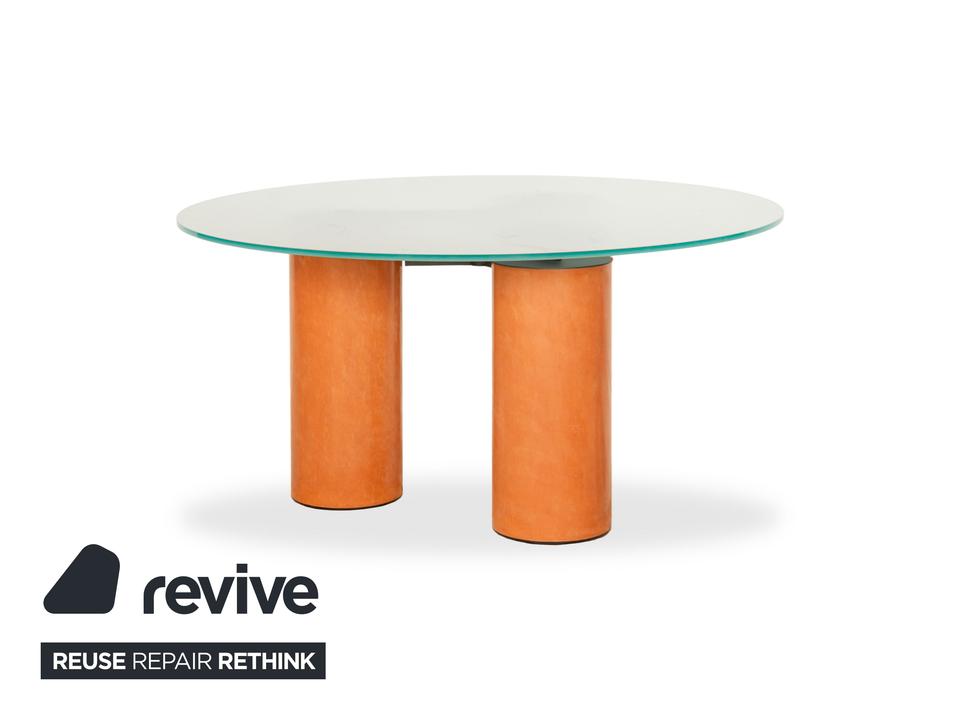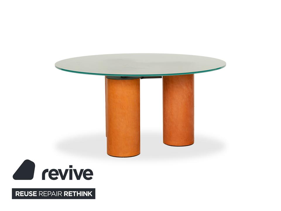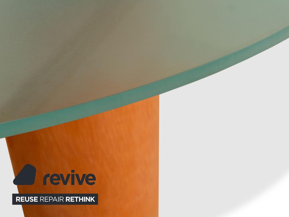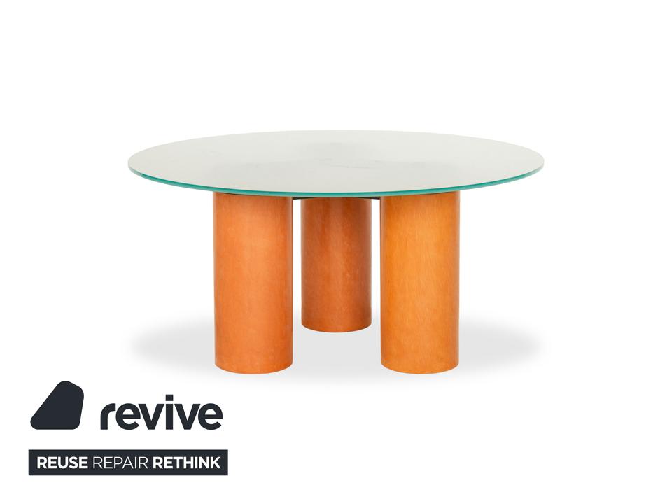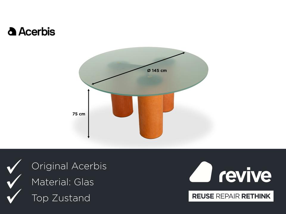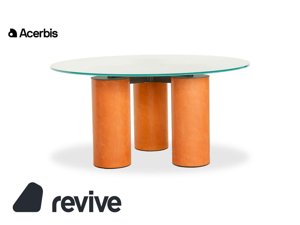 Der Tisch Serenissimo von Acerbis besteht aus einer runden Glasplatte und steht auf drei Füßen aus Holz. Er zeichnet sich durch die moderne, stilvolle Optik und das schlichte Design aus.