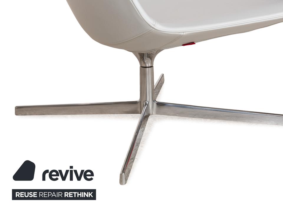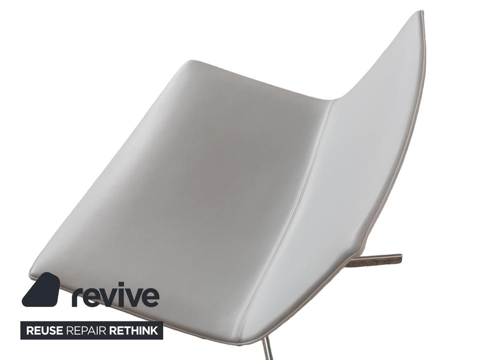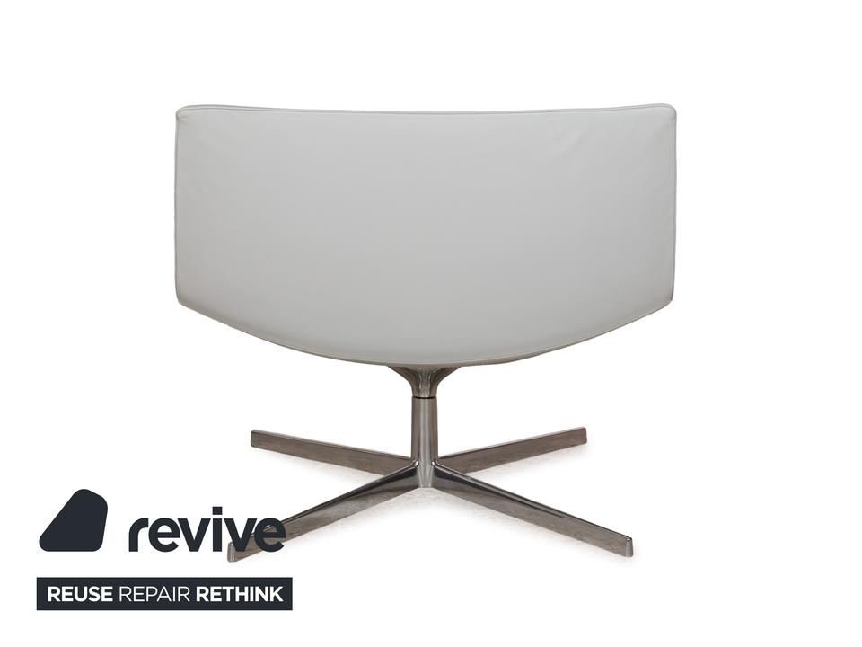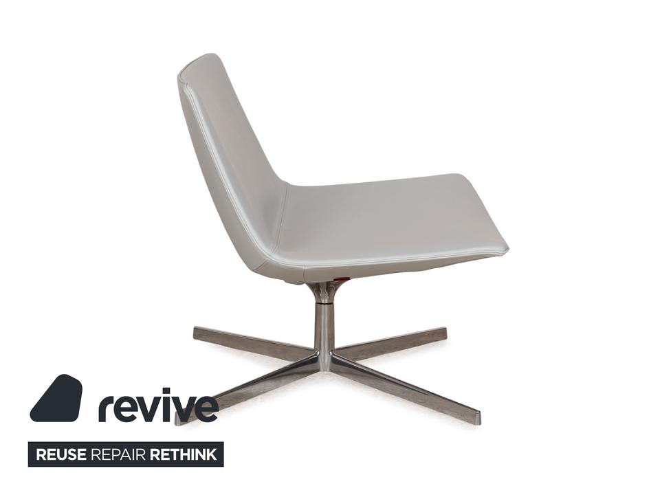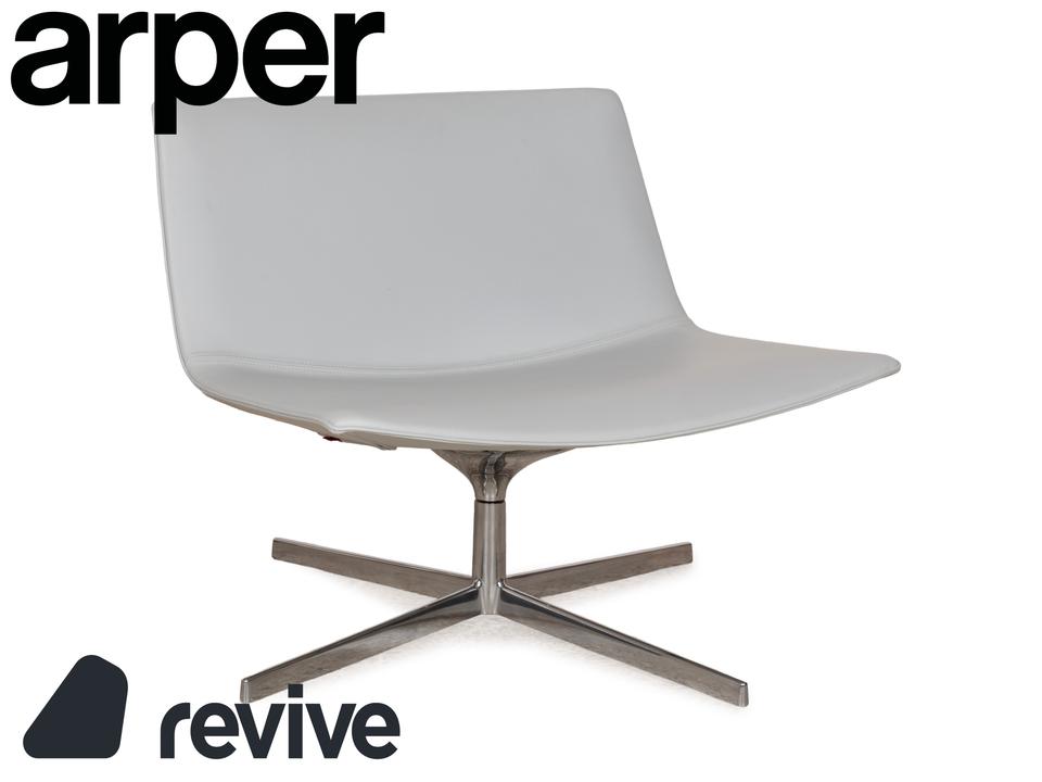 Der Sessel Catifa 80 von Arper ist ein Zeichen für schlichtes, gelungenes Design. Der mit hellgrau-blauem Leder bezogene Korpus des Sessels ist auf einem Metrallgestell mit Drehfunktion montiert und verzichtet auf jegliche Schnörkel und Extras – so kommen die klaren Kanten und minimalen Schwünge in der Gestaltung gut zur Geltung.