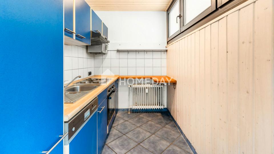 Die Küche ist funktional gestaltet und mit einer hochwertigen Einbauküche ausgestattet, die über Markengeräte verfügt – ideal für alle, die Wert auf Komfort und Qualität legen. Das innenliegende Badezimmer ist hell gefliest und verfügt über eine moderne Dusche sowie einen eleganten Handtuchwärmer. Der Zustand ist gepflegt und zeitlos.