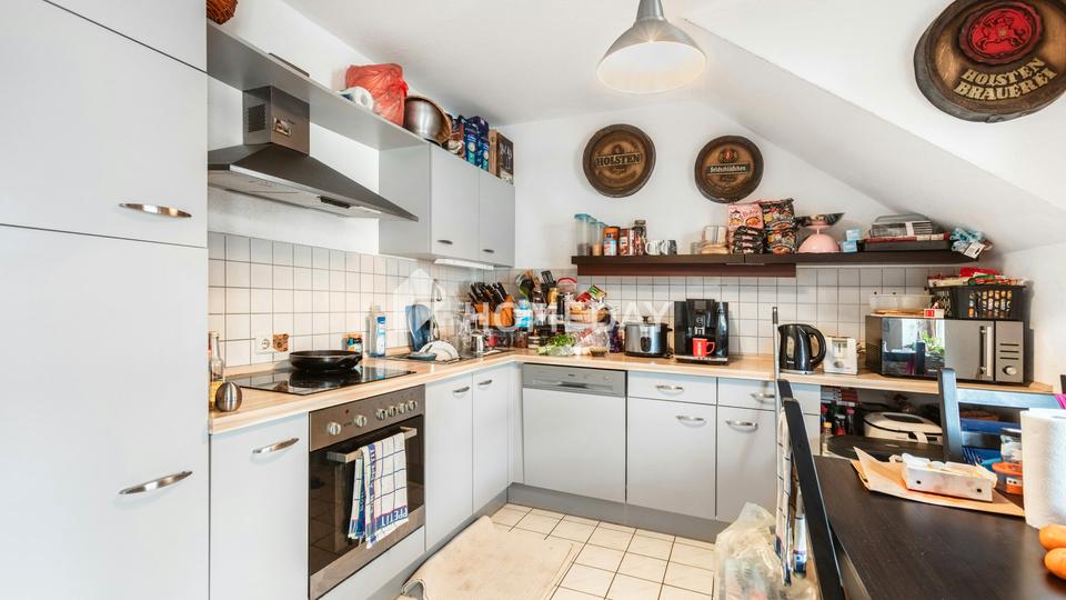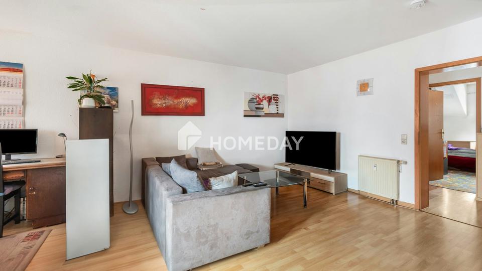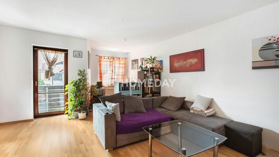 Der Mittelpunkt der Wohnung ist das helle Wohnzimmer, das mit seiner offenen Atmosphäre und dem direkten Zugang zum Balkon einen besonders einladenden Wohnbereich schafft. Der Balkon umfasst rund 5,8 Quadratmeter und eröffnet einen schönen Blick in die ruhige Nachbarschaft – ideal für entspannte Stunden im Freien. Auch die angrenzende Küche bietet dank ihrer praktischen Aufteilung ein angenehmes Arbeitsumfeld und fügt sich harmonisch in das Gesamtbild ein.