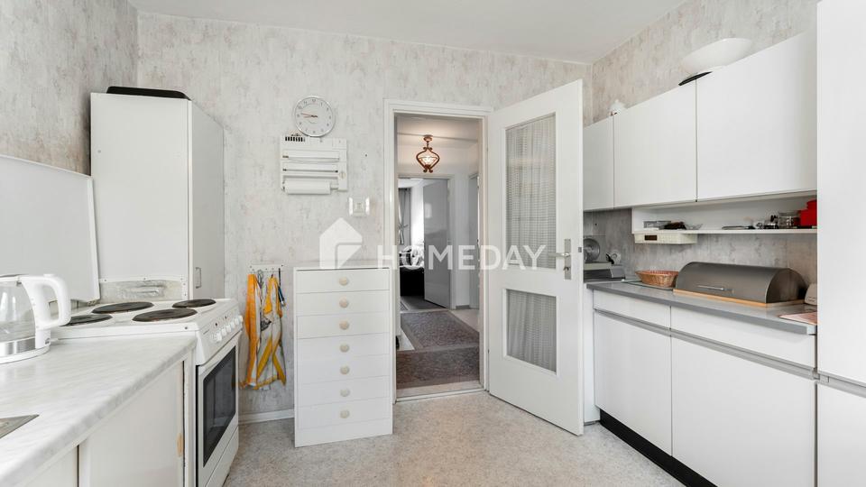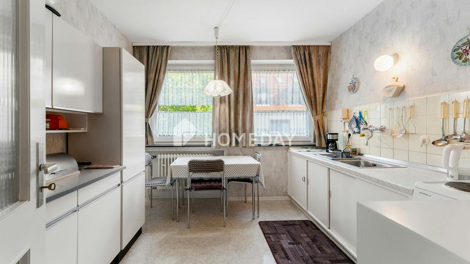 • In der Küche findet sich ausreichend Platz für Einbaumöbel und Sitzgelegenheiten.