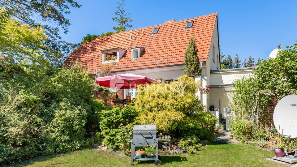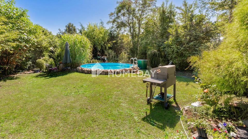 Der Außenbereich ist ein echtes Highlight: Der gepflegte Garten mit Rasenflächen, Sträuchern und Bäumen bietet ausreichend Platz zum Spielen und Verweilen. Neben dem großen Pool lädt auch die Terrasse zum Sonnen und Genießen ein – ein idealer Ort für Grillabende mit Familie und Freunden. Eine Garage komplettiert das Angebot.