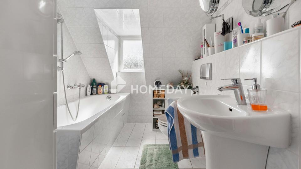 Im Obergeschoss befinden sich zwei gut geschnittene Schlafzimmer, die vielfältige Nutzungsmöglichkeiten bieten. Ergänzt wird die Etage durch ein helles Tageslichtbad mit Badewanne, das modernisiert wurde und genügend Platz für die ganze Familie bereithält. Großzügige Fenster sorgen für viel Licht und ein angenehmes Wohngefühl.