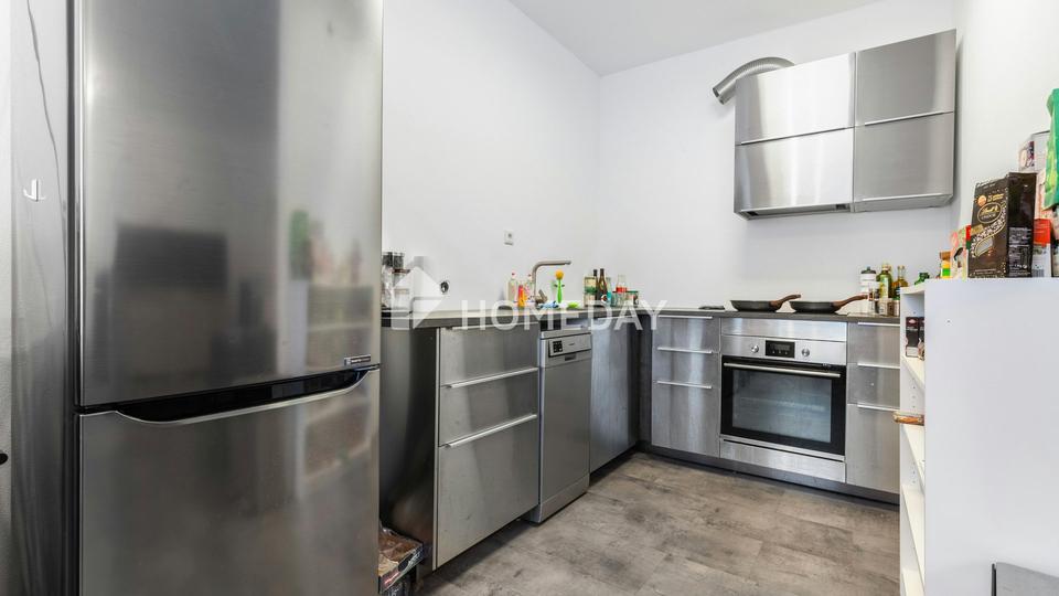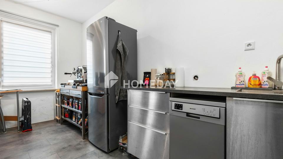 Das Herzstück ist das helle Wohnzimmer, das durch seine vielen Fenster mit Tageslicht durchflutet wird und eine einladende Atmosphäre schafft. Hier lassen sich sowohl eine gemütliche Sofaecke als auch ein Essbereich harmonisch integrieren. Die angrenzende halboffene Küche verbindet Funktionalität mit modernem Design. Ausgestattet mit einer Einbauküche in Edelstahloptik bietet sie ausreichend Arbeitsfläche und Stauraum.