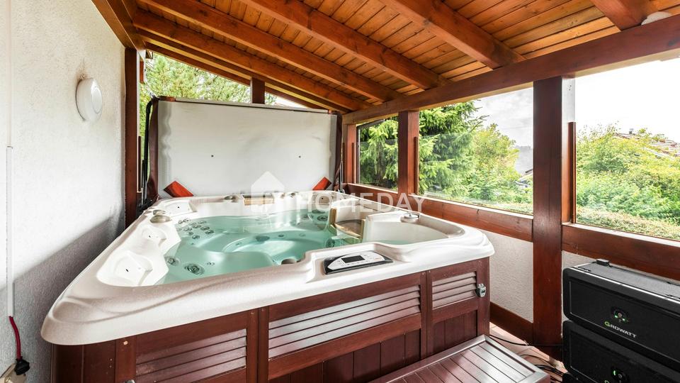 Das Erdgeschoss bietet ein großes Wohnzimmer mit Kachelofen, das durch seine westliche Ausrichtung und den direkten Zugang zur Terrasse lichtdurchflutet ist. Ein Wintergarten mit Whirlpool schafft hier eine besondere Wohlfühlatmosphäre. Der offene Übergang zum Esszimmer verstärkt das großzügige Wohngefühl. Die angrenzende Küche ist mit einer funktionalen Einbauküche ausgestattet und bietet Zugang zu einer kleinen, nach Süden ausgerichteten Terrasse – ideal für den morgendlichen Kaffee. Zwei gut geschnittene Schlafzimmer sowie ein Tageslichtbad mit Badewanne und Dusche sorgen für Komfort. Ein separates Gäste-WC ergänzt das Raumangebot auf dieser Ebene.