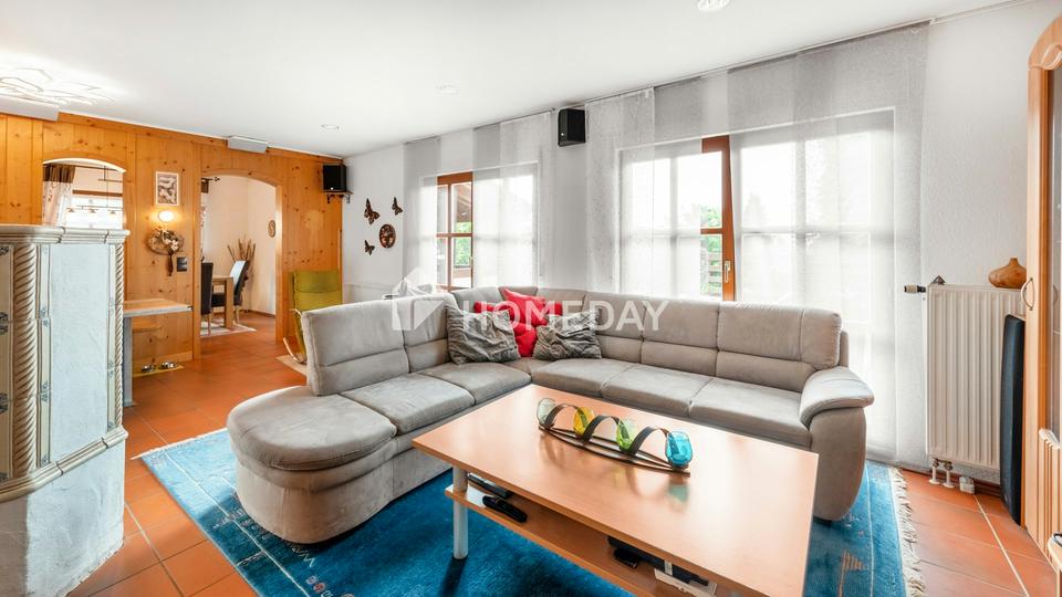Die Holzfenster mit Rollläden fügen sich harmonisch in das Erscheinungsbild des Hauses ein und tragen zur Wärmedämmung bei. Fliesen, Laminat und Auslegware sorgen in den Wohnräumen für ein wohnliches Ambiente. Für ausreichend Stellfläche sorgt eine geräumige Doppelgarage.