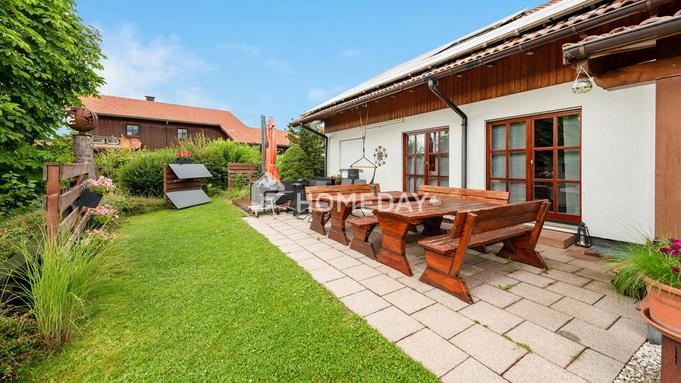Der liebevoll gepflegte Garten mit mehreren Terrassenbereichen lädt zum Verweilen ein und bietet sowohl sonnige als auch schattige Plätze – ideal für Familienleben, Gartenfreunde oder entspannte Stunden im Freien.
