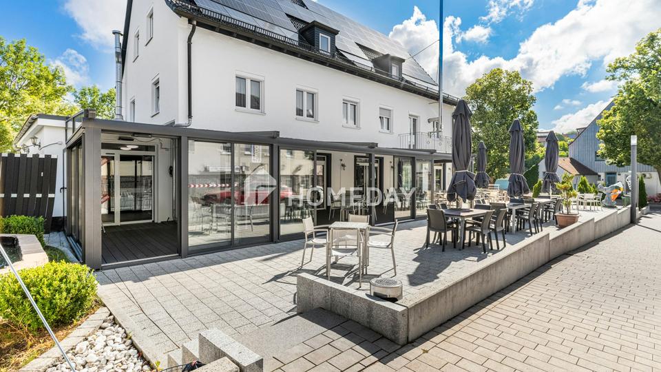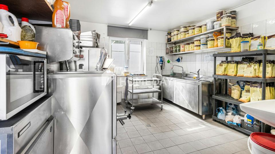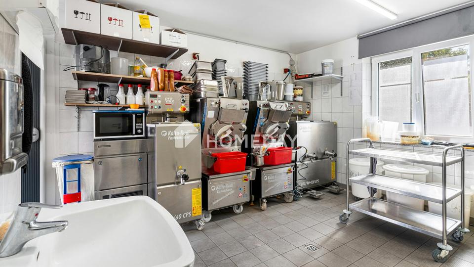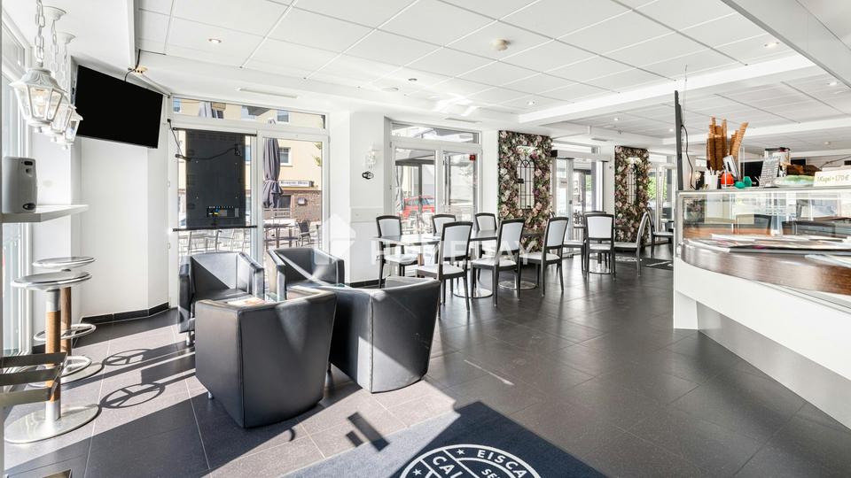 Im Erdgeschoss befinden sich zwei eigenständige Gewerbeeinheiten mit min. 180 m² Innenfläche und großzügiger Außenfläche: ein Eiscafé (inklusiver eigener Eisproduktion) sowie ein Imbiss. Der Imbiss ist derzeit verpachtet und bietet verlässliche Mieteinnahmen. Das Eiscafé wird vom aktuellen Eigentümer seit über 20 Jahren erfolgreich selbst betrieben und befindet sich in einem modernen, einladenden Zustand. Dank großzügiger Außenterrasse, wintergartenartiger Elemente und vollständig ausgestatteter Küchenbereiche bieten beide Einheiten attraktive Voraussetzungen für Gastronomie oder ähnliche Nutzungskonzepte.