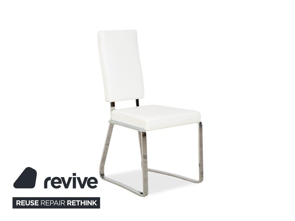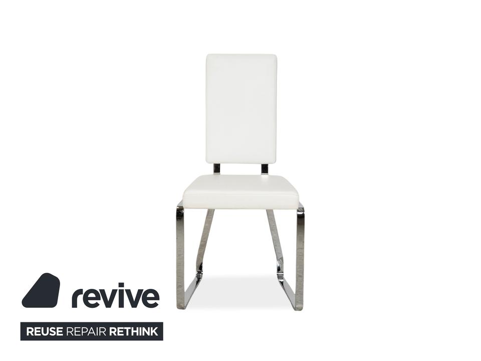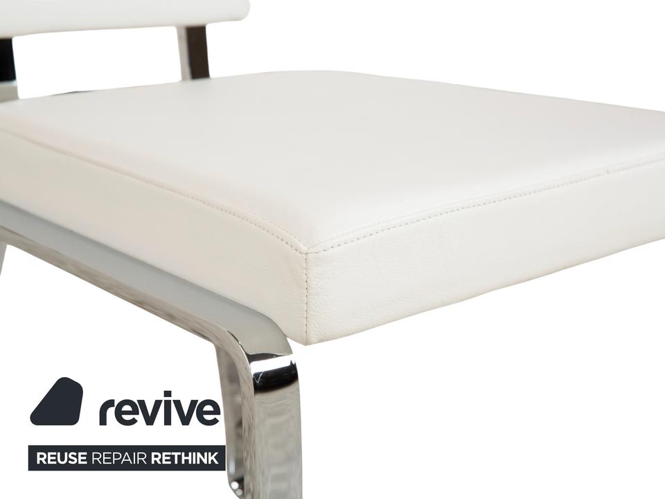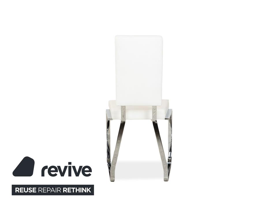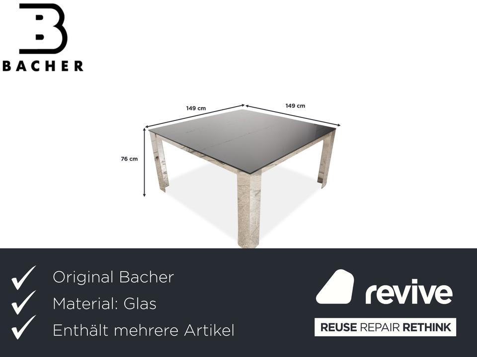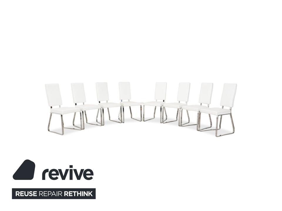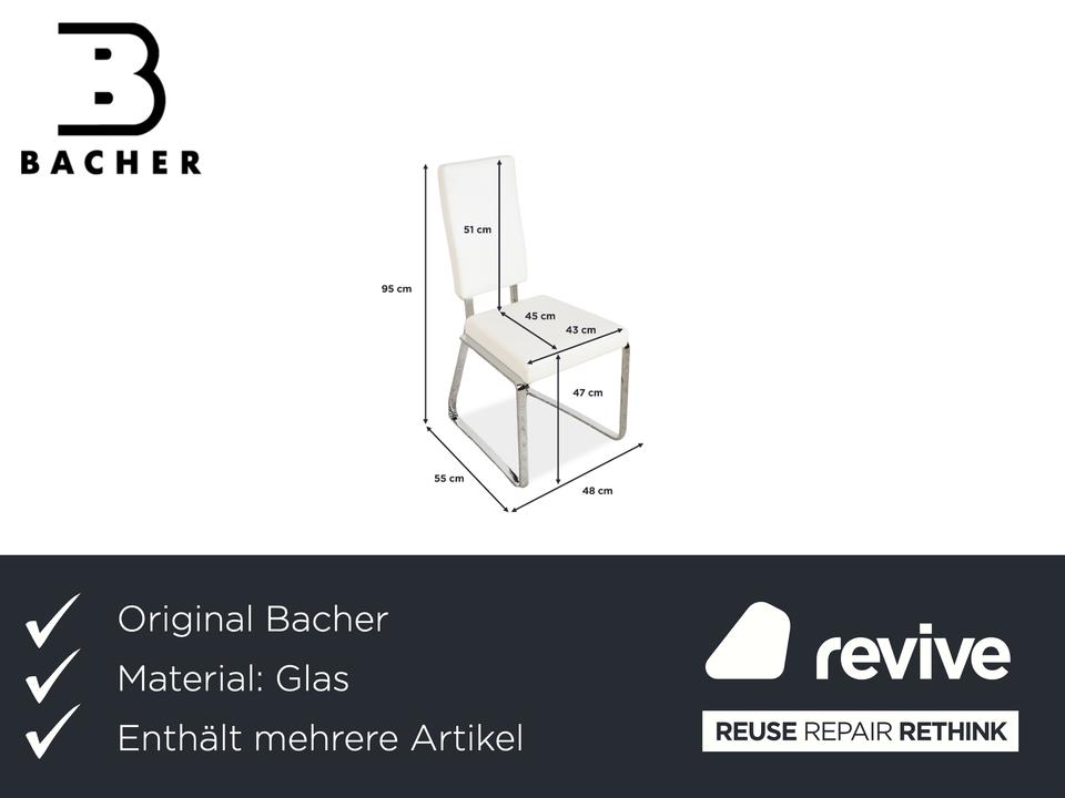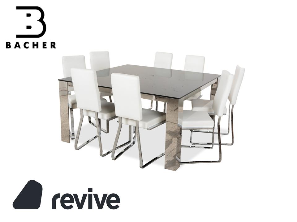 Mit diesem großen Set von Bacher holst du dir eine komplette, aufeinander abgestimmte Dining-Lounge ins Haus. Das Herzstück ist der elegante Esstisch mit seiner klaren Glasplatte und dem markanten, silbernen Gestell. Das Glas sorgt für Transparenz und lässt die große Tafel nicht wuchtig wirken, während die breiten Tischbeine für Stabilität und eine moderne, architektonische Optik sorgen.Dazu gesellen sich gleich acht passende Freischwinger-Stühle. Das ist selten zu finden und ideal, wenn du gerne Gäste empfängst. Die Stühle sind in feines, cremeweißes Leder gehüllt, das den Raum sofort hell und freundlich macht. Das glänzende Chromgestell der Stühle greift den Look des Tisches perfekt auf, sodass die ganze Gruppe wie aus einem Guss wirkt. Dank der hohen Rückenlehnen und der leicht federnden Kufen-Konstruktion sitzen du und deine Gäste auch bei langen Dinner-Abenden bequem und entspannt. Ein hochwertiges Komplett-Paket für den modernen Essbereich.