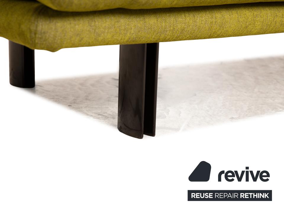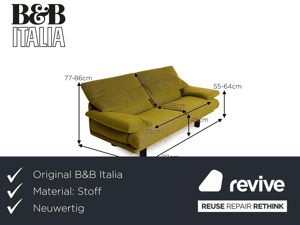Das Alanda Sofa von B&B Italia ist mit einem grünen Stoff bezogen und steht auf schmalen Füßen. Der Dreisitzer überzeugt mit seinen verstellbaren Kopf- und Armlehnen und dem zeitlosen Design.