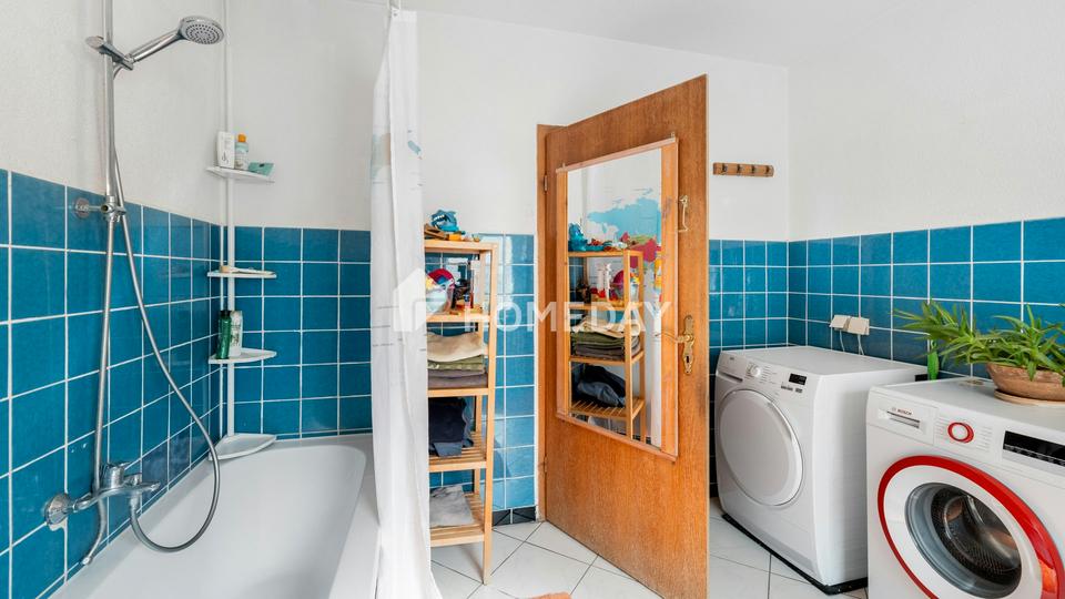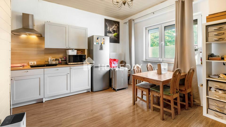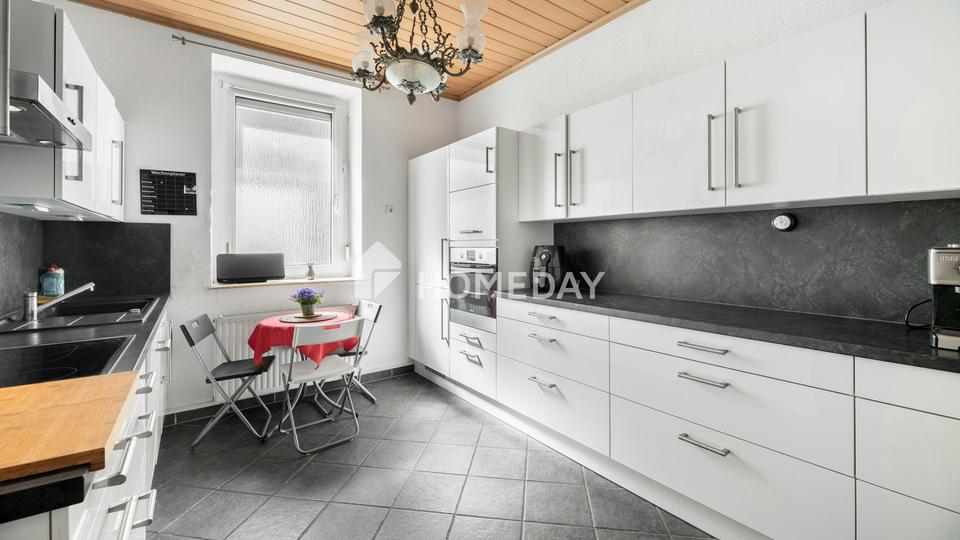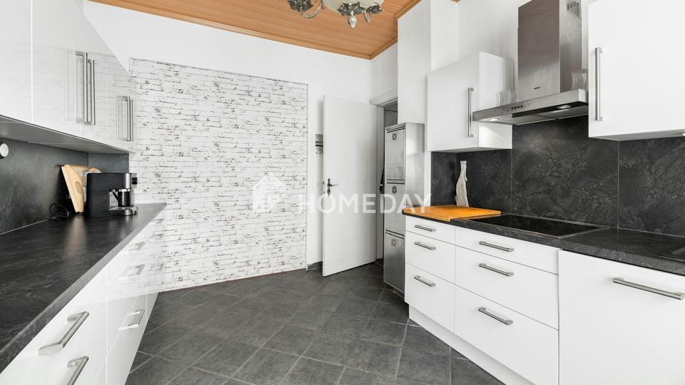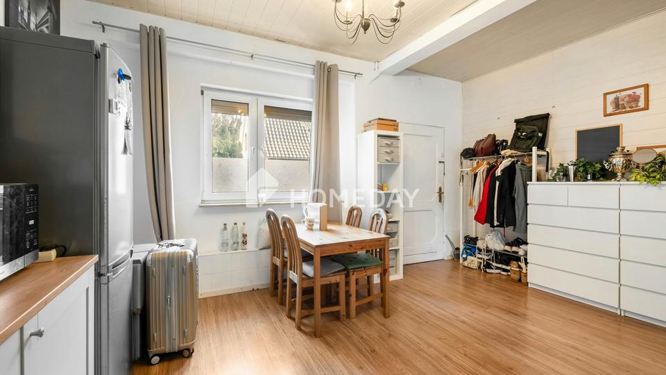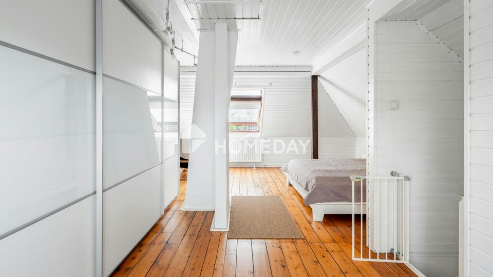 Ein großzügiger Wohnbereich mit hochwertigem Echtholz-Mobiliar bildet das Herzstück. Die stilvolle Küche ist mit weißen Einbauten (Teutonia), Markengeräten und eleganten, dunklen Bodenfliesen ausgestattet. Das helle Tageslichtbad überzeugt mit einer Badewanne sowie einer integrierten Waschmaschine und einem Trockner und bietet damit hohen Alltagskomfort. Drei gut geschnittene Schlafzimmer bieten vielfältige Nutzungsmöglichkeiten – ideal für Familien oder Wohngemeinschaften. Besonderes Highlight ist das gemütliche Dachgeschoss mit sichtbaren Holzbalken und Dachflächenfenstern, das dem Wohnraum einen besonderen Charakter verleiht.