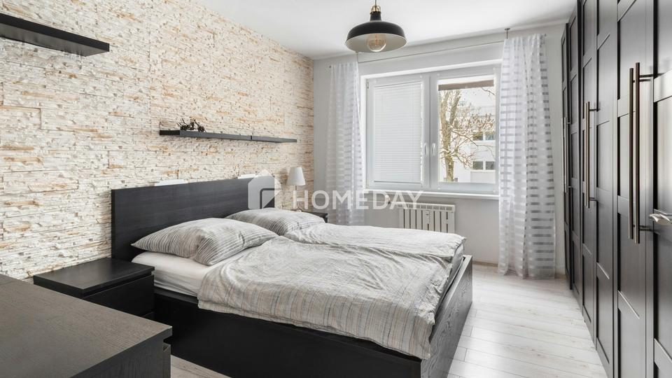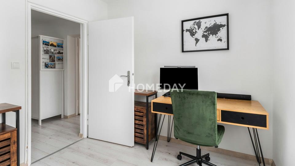 Das Schlafzimmer bietet ausreichend Platz für ein großes Bett sowie Stauraum und ist ebenfalls vollständig möbliert. Die ruhige Lage sorgt für erholsame Nächte. Ein weiteres Zimmer ergänzt das Raumangebot und lässt sich flexibel nutzen, ob als Kinderzimmer, Homeoffice oder Gästezimmer. Auch hier setzt sich der gepflegte, zeitlose Stil der Wohnung konsequent fort.