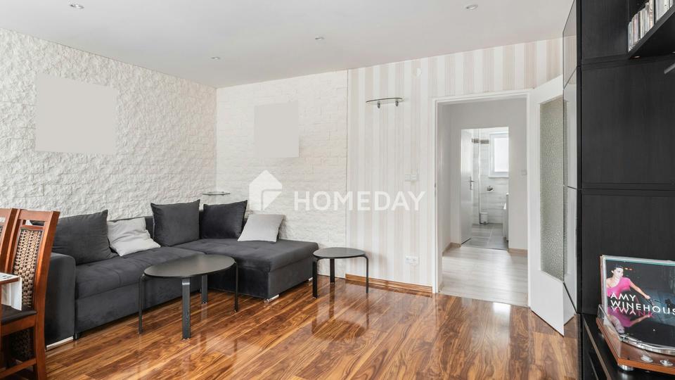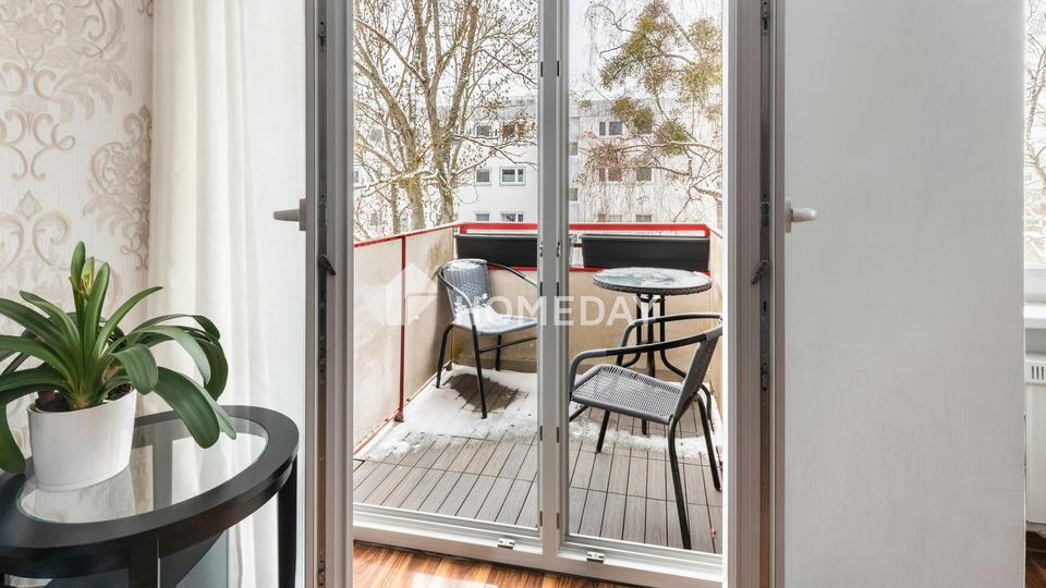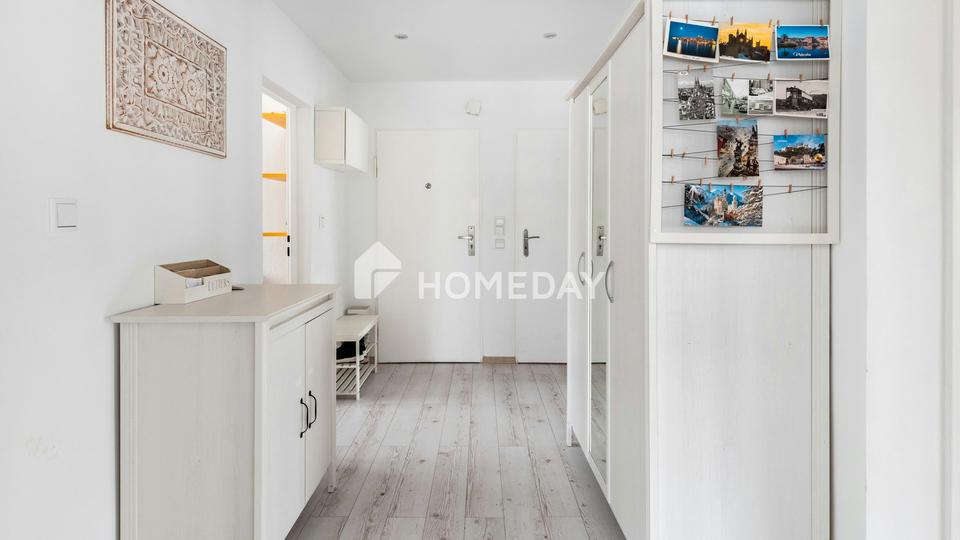 Direkt anschließend öffnet sich der Blick in das großzügige Wohnzimmer, das sich lichtdurchflutet und geschmackvoll eingerichtet präsentiert. Der warme Bodenbelag, die harmonisch aufeinander abgestimmten Möbel und die klare Raumaufteilung schaffen eine Atmosphäre, in der man sich sofort zuhause fühlt. Von hier aus gelangen Sie auf den nach Westen ausgerichteten Balkon, ein ruhiger Rückzugsort, der dazu einlädt, den Tag entspannt ausklingen zu lassen und die Abendsonne zu genießen.