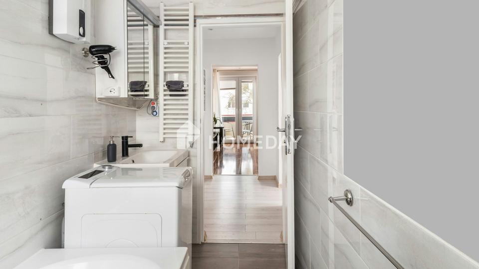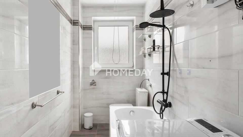 Das Tageslichtbad überzeugt mit seiner freundlichen Gestaltung und soliden Ausstattung. Eine Badewanne, ein Handtuchheizkörper, Waschmaschinenanschluss, Waschmaschine sowie ein Spiegelschrank fügen sich harmonisch in das Gesamtbild ein. Ein praktischer Abstellraum im Flur sorgt zusätzlich für Ordnung im Alltag.