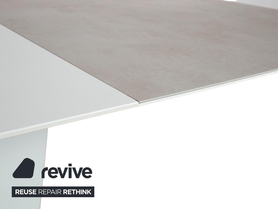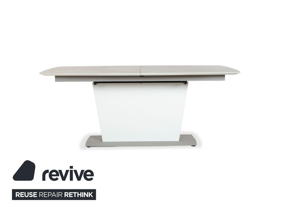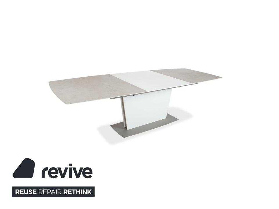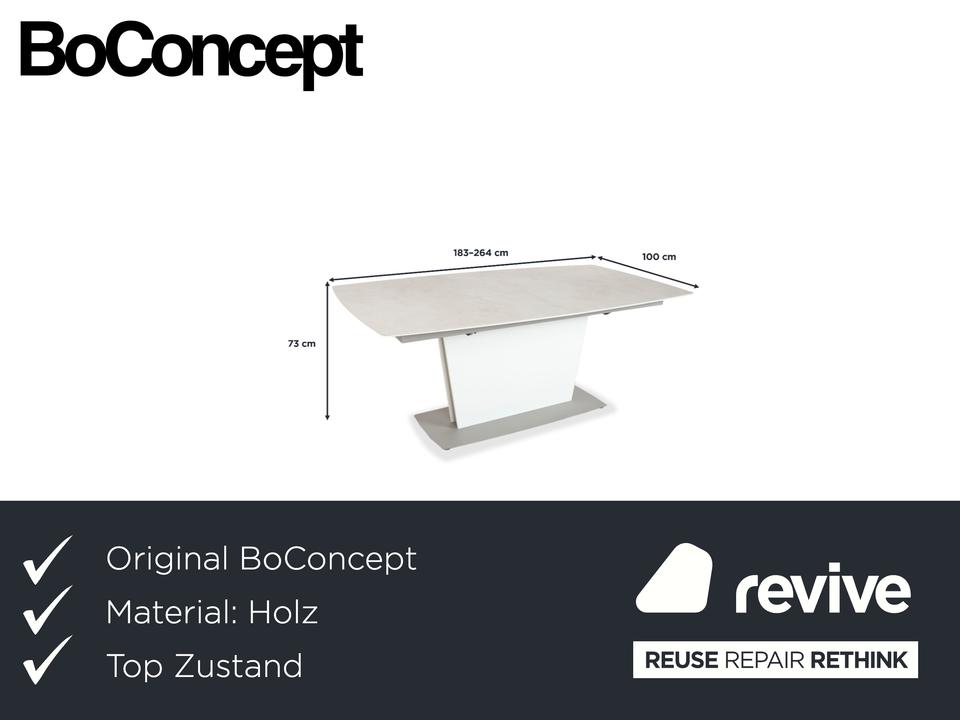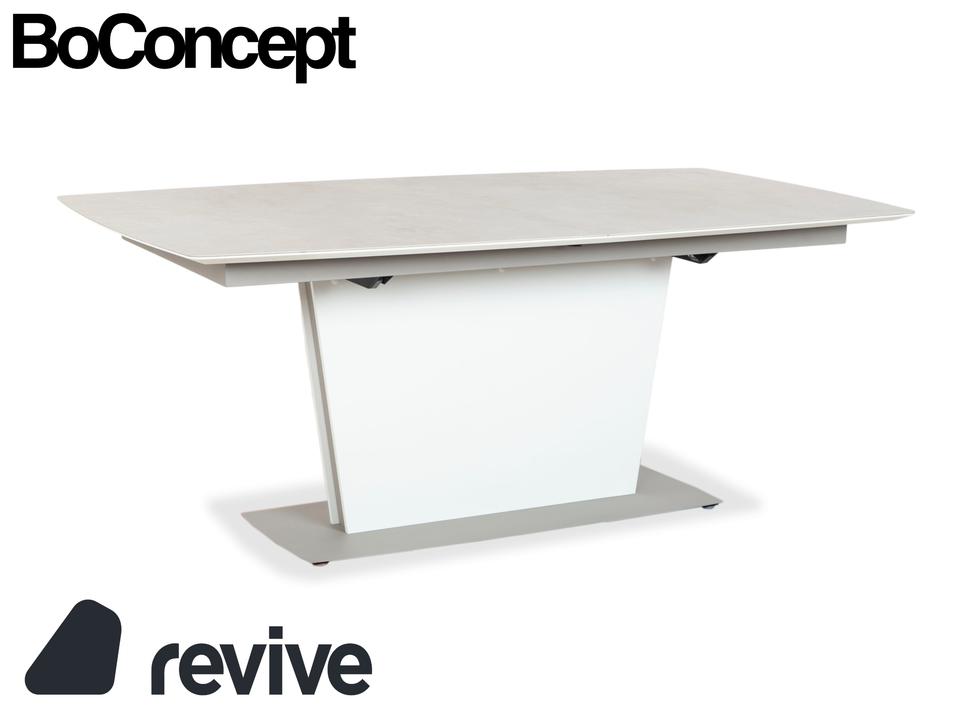 BoConcept Milano: Stilvolles RaumwunderDer Esstisch „Milano“ von BoConcept ist der Inbegriff moderner Funktionalität. Er verbindet ein klares, architektonisches Design mit cleverer Technik, die ihn zum perfekten Gastgeber für jede Gelegenheit macht.Die Tischplatte besteht aus einem hochwertigen Verbundstoff (Kunststoff) in einer hellen Beton- oder Keramik-Optik. Diese Oberfläche ist extrem pflegeleicht, robust und verleiht dem Tisch durch ihr schlankes Profil eine sehr elegante, moderne Note. Statt auf vier Beinen ruht die Platte auf einem zentralen Säulenfuß. Dieser ist als breites, flaches Panel gestaltet (in Weiß oder Hellgrau), was nicht nur futuristisch aussieht, sondern auch maximale Beinfreiheit für alle Gäste garantiert, da keine Tischbeine im Weg sind.Für Stabilität sorgt eine flache Bodenplatte aus Metall (in Grau/Stahl-Optik), die den modernen Materialmix abrundet. Das Herzstück ist die integrierte Ausziehfunktion: Unter der schmalen Tischplatte verbirgt sich eine ausgeklügelte Mechanik (die seitlichen Führungsschienen sind unter der Platte erkennbar). So lässt sich der kompakte Tisch im Handumdrehen verlängern, um Platz für große Dinner-Runden zu schaffen.