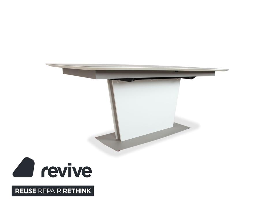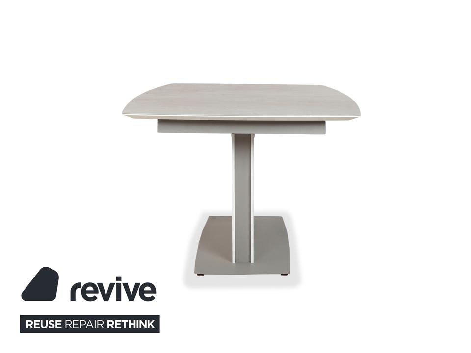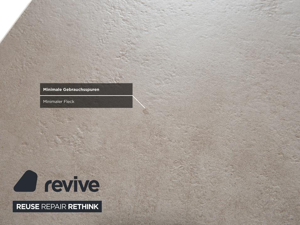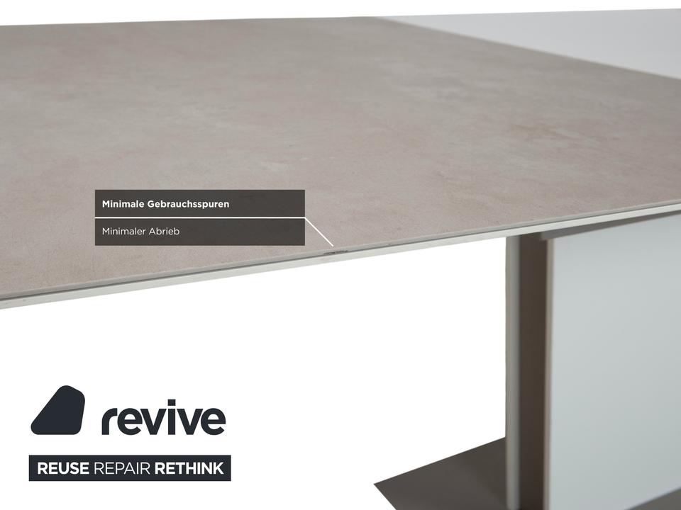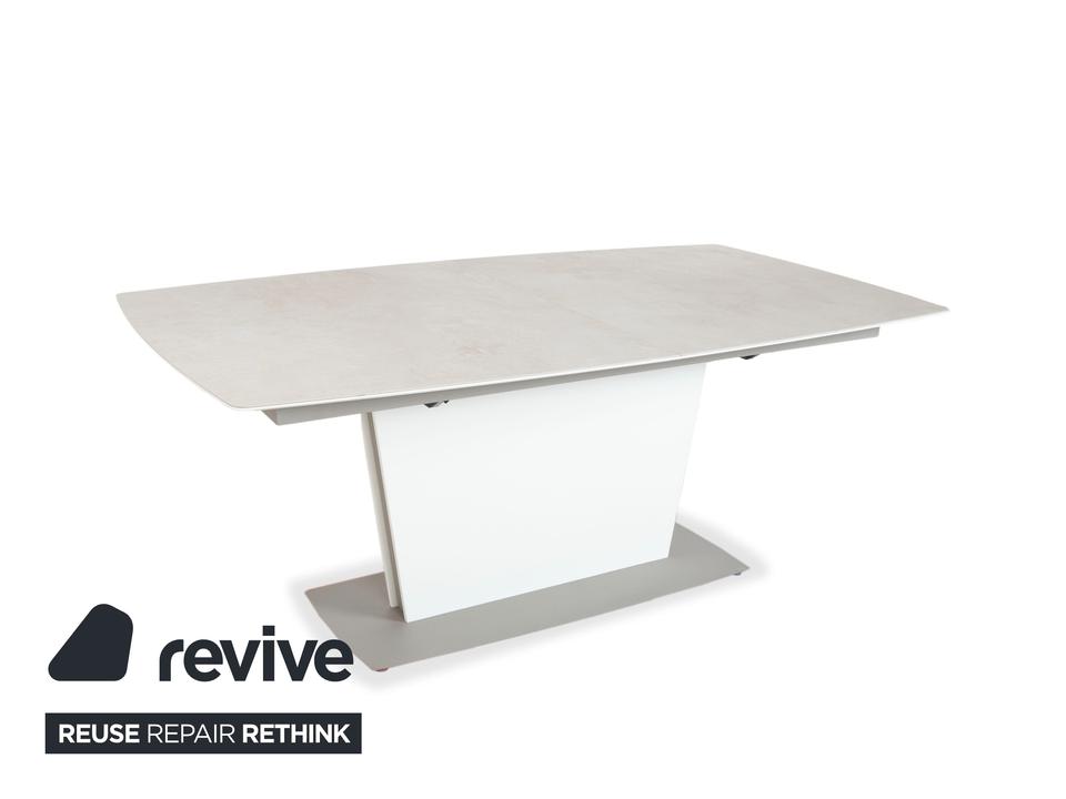 BoConcept Milano: Stilvolles RaumwunderDer Esstisch „Milano“ von BoConcept ist der Inbegriff moderner Funktionalität. Er verbindet ein klares, architektonisches Design mit cleverer Technik, die ihn zum perfekten Gastgeber für jede Gelegenheit macht.Die Tischplatte besteht aus einem hochwertigen Verbundstoff (Kunststoff) in einer hellen Beton- oder Keramik-Optik. Diese Oberfläche ist extrem pflegeleicht, robust und verleiht dem Tisch durch ihr schlankes Profil eine sehr elegante, moderne Note. Statt auf vier Beinen ruht die Platte auf einem zentralen Säulenfuß. Dieser ist als breites, flaches Panel gestaltet (in Weiß oder Hellgrau), was nicht nur futuristisch aussieht, sondern auch maximale Beinfreiheit für alle Gäste garantiert, da keine Tischbeine im Weg sind.Für Stabilität sorgt eine flache Bodenplatte aus Metall (in Grau/Stahl-Optik), die den modernen Materialmix abrundet. Das Herzstück ist die integrierte Ausziehfunktion: Unter der schmalen Tischplatte verbirgt sich eine ausgeklügelte Mechanik (die seitlichen Führungsschienen sind unter der Platte erkennbar). So lässt sich der kompakte Tisch im Handumdrehen verlängern, um Platz für große Dinner-Runden zu schaffen.