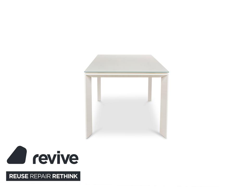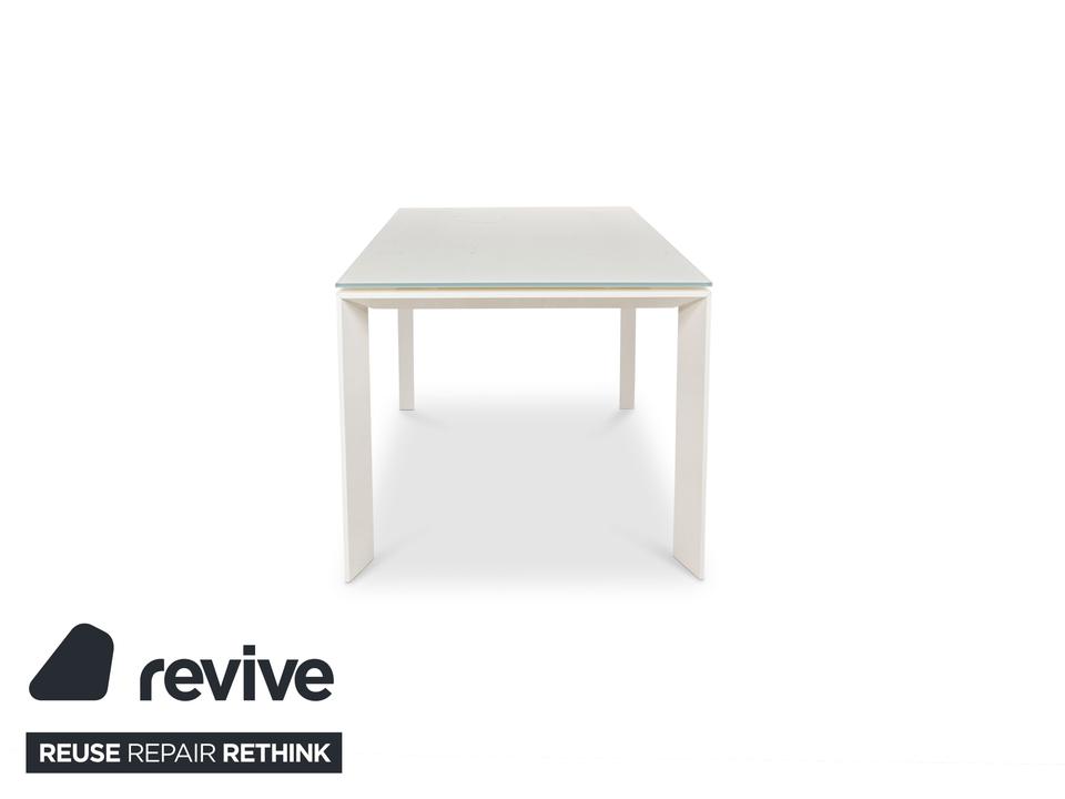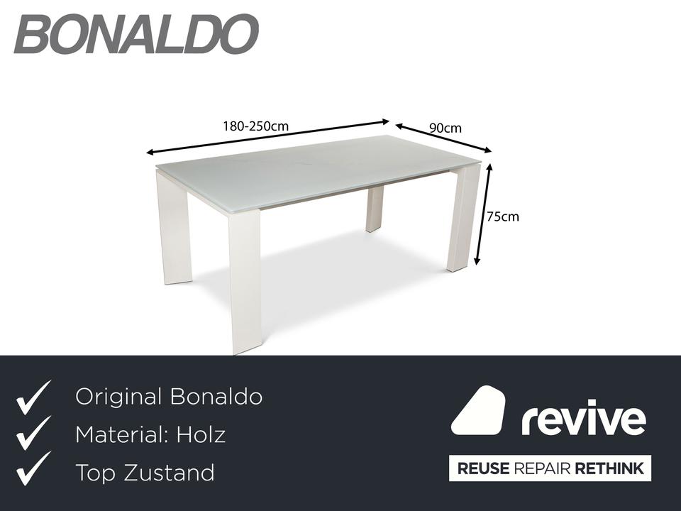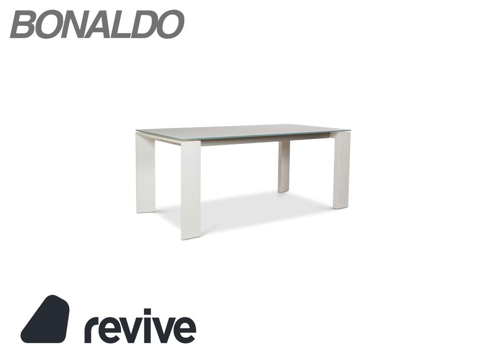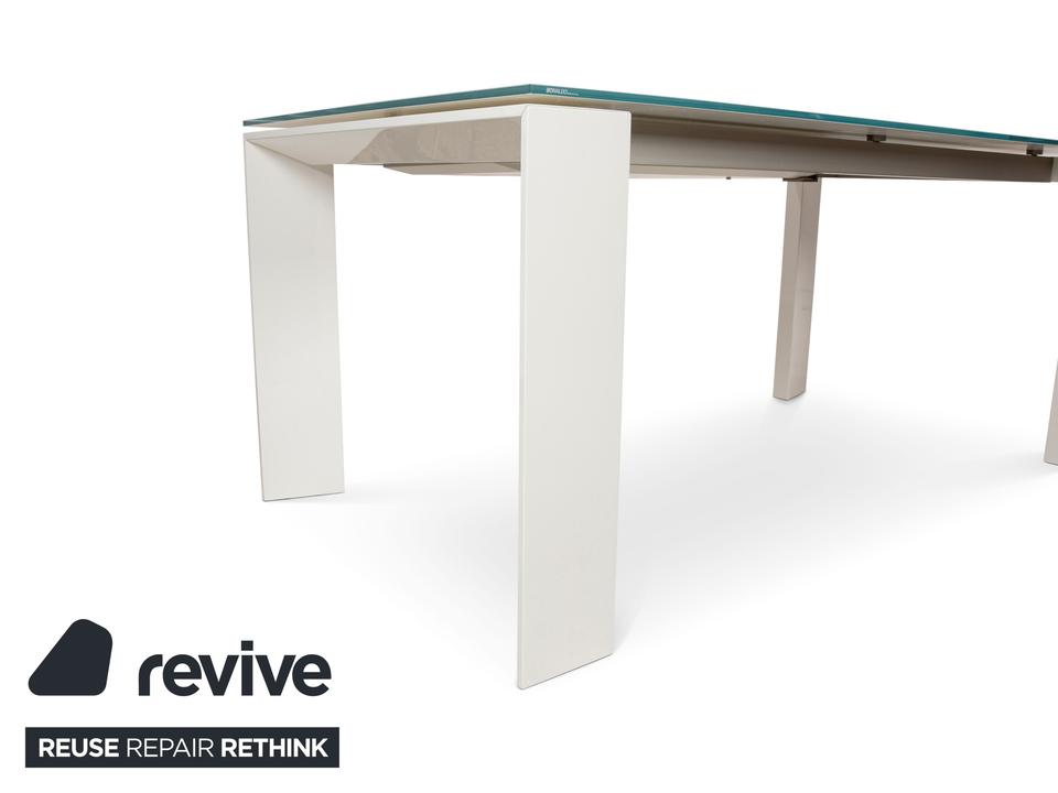 Der Esstisch Twice von Bonaldo besteht aus einer Tischplatte aus hellgrünem Glas und steht auf weißen Holzfüßen. Er zeichnet sich durch das helle, harmonische Design und die stilvolle Optik aus. Die Tischplatte lässt sich von 180cm auf 250cm erweitern.