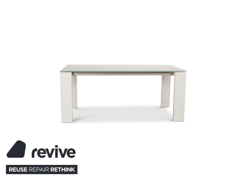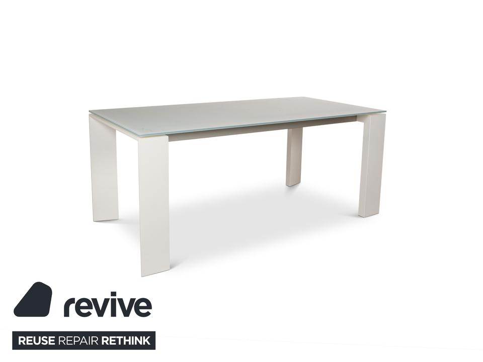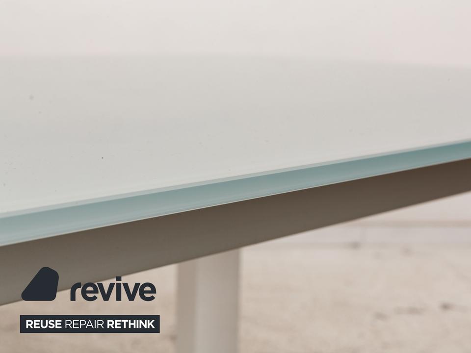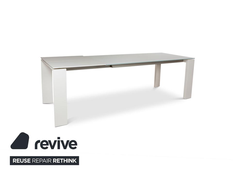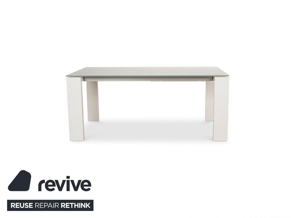 Der Esstisch Twice von Bonaldo besteht aus einer Tischplatte aus hellgrünem Glas und steht auf weißen Holzfüßen. Er zeichnet sich durch das helle, harmonische Design und die stilvolle Optik aus. Die Tischplatte lässt sich von 180cm auf 250cm erweitern.