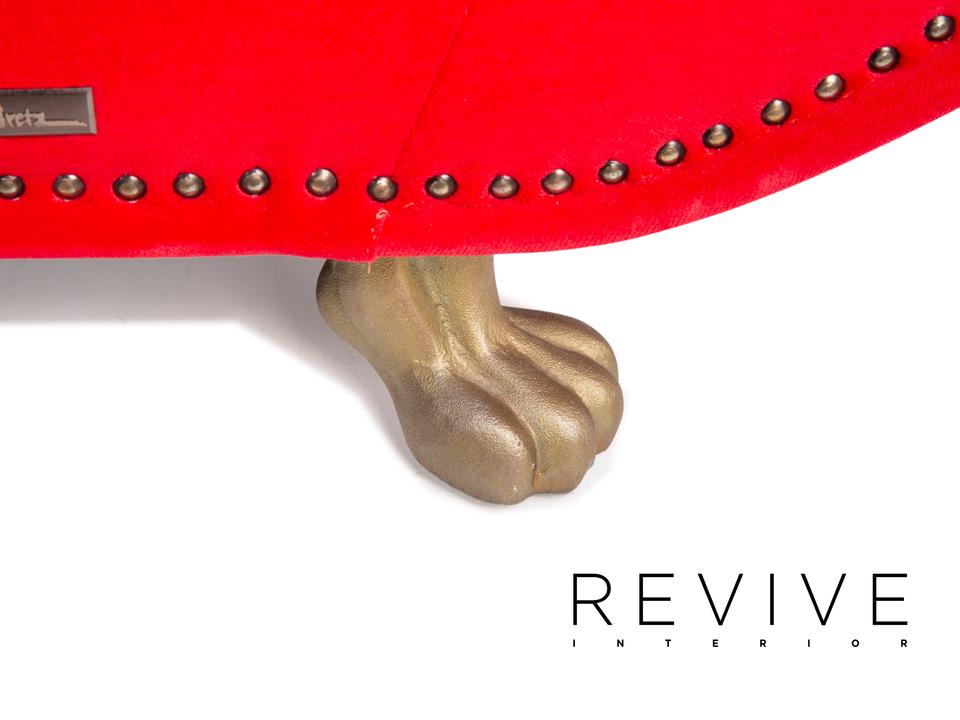 Mit der roten Sofa Garnitur von Bretz, mit hochwertigem Samtstoff bezogen, zeigst du Charakter. Kurven und Extravaganz sorgen für einen Hingucker in jedem Raum, die weiche Polsterung lädt zum Entspannen ein. Die Möbel stehen auf golden lackierten Füßen im Form von Löwentatzen.