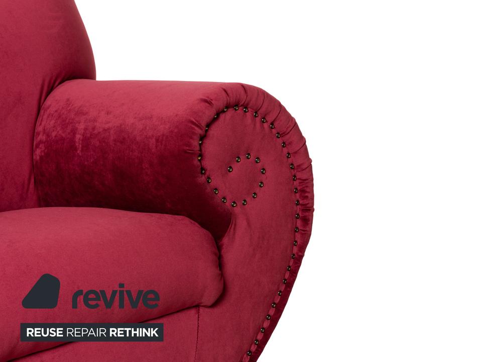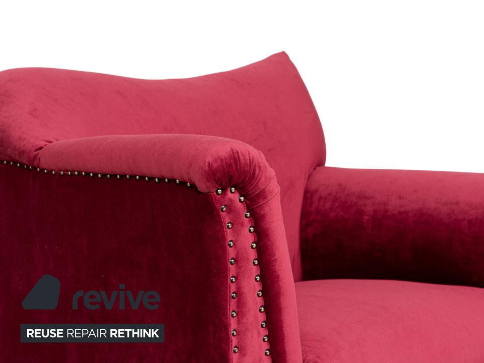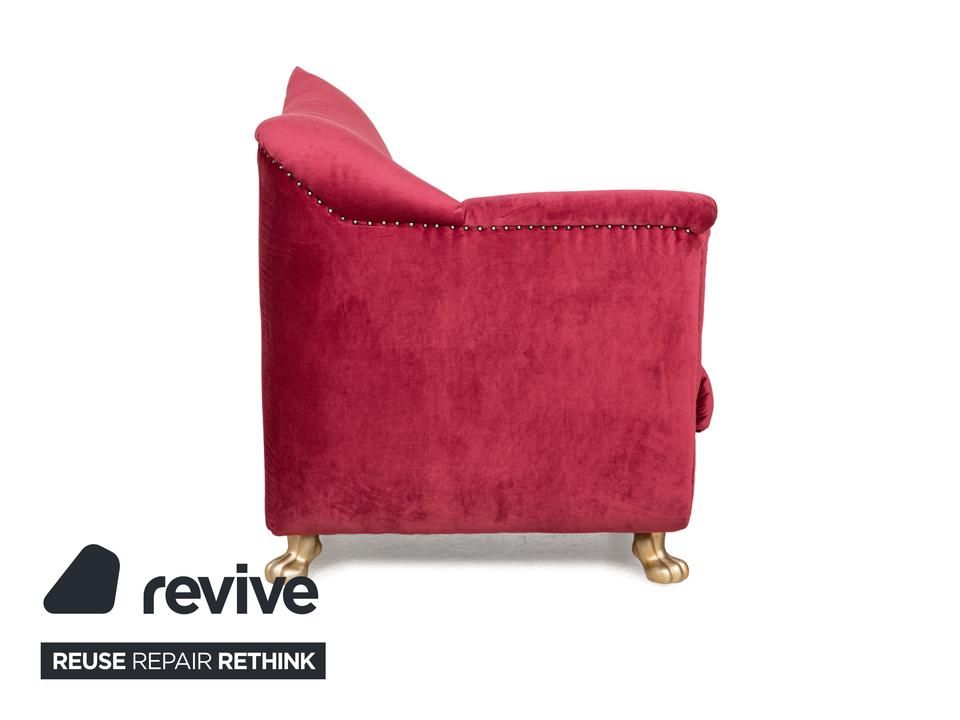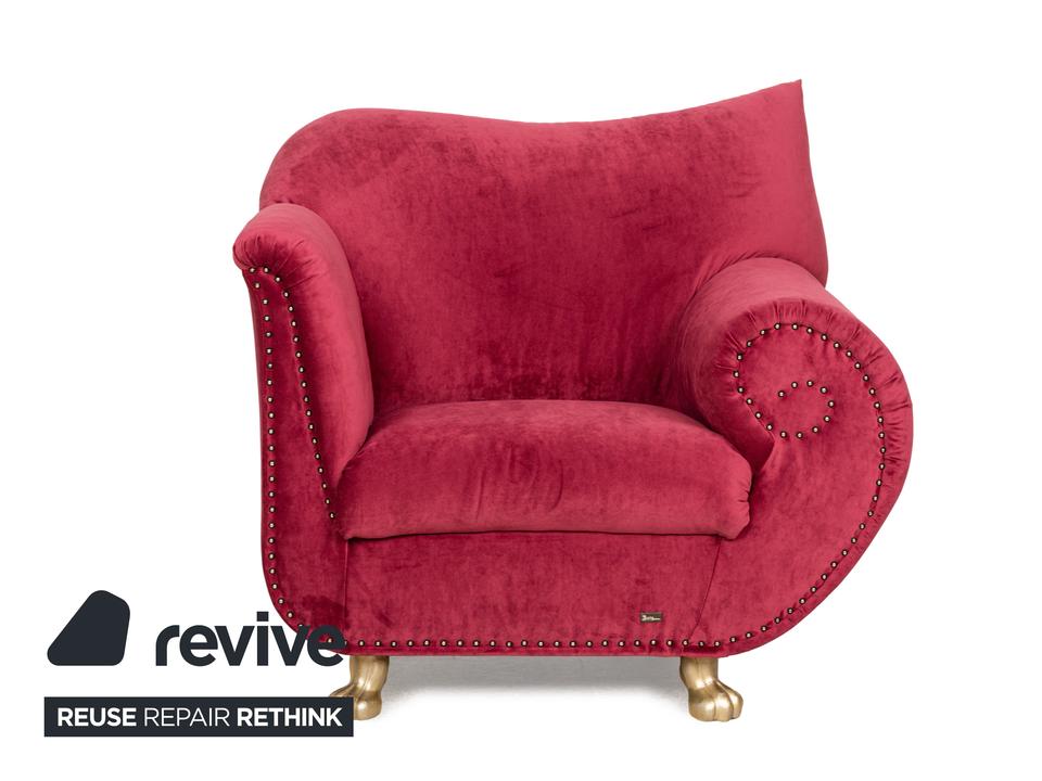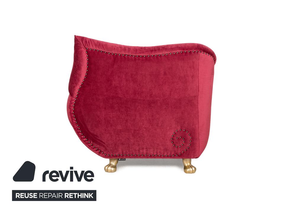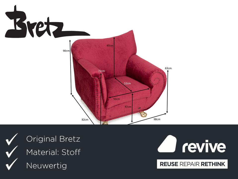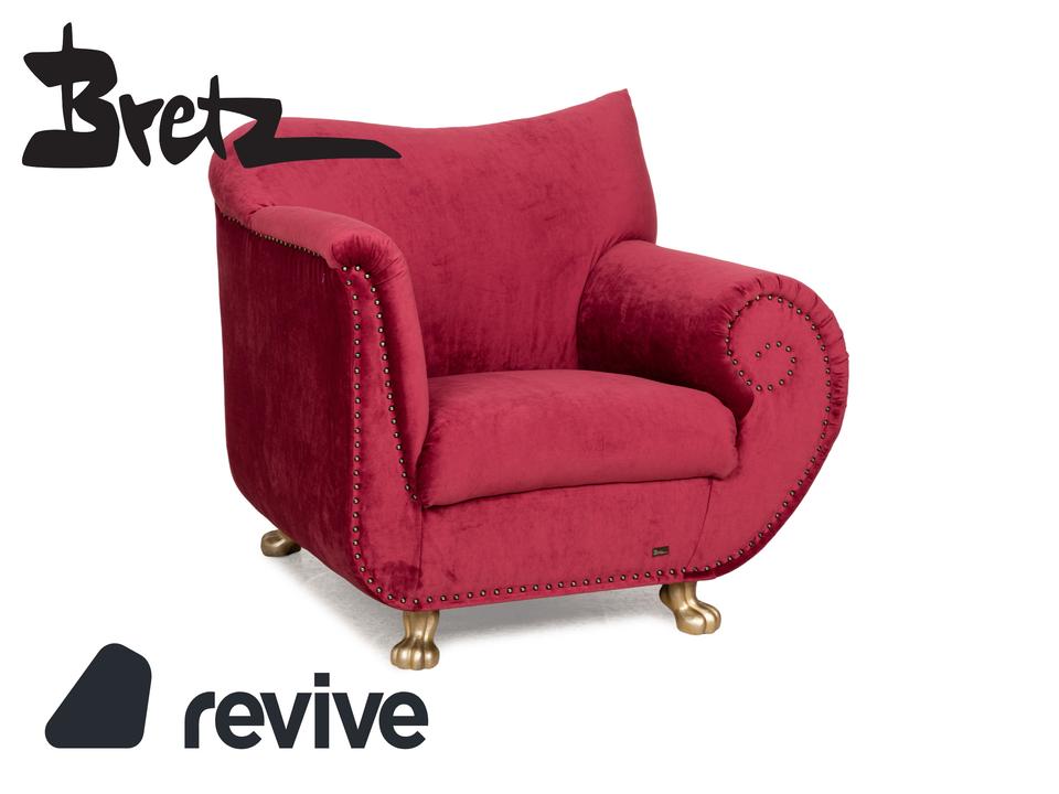 Dieser luxuriöse Bretz Gaudi Stoff Sessel mit einem Stoff-Neubezug in einem Beeren-Rot strahlt durch seine geschwungene Form und den samtartigen Bezug ein edles und klassisches Flair aus. Die feinen Details, wie die abgerundeten Armlehnen und die Nietenverzierungen, verleihen ihm eine besonders elegante Note. Die verzierten Standfüße, die an Löwentatzen erinnern, unterstreichen das klassische Vintage-Design.