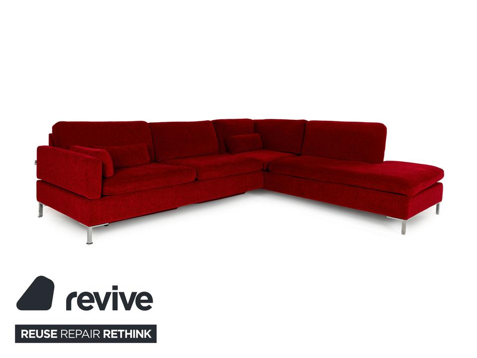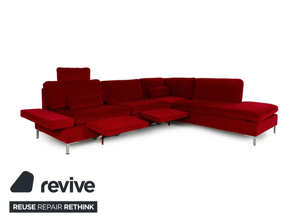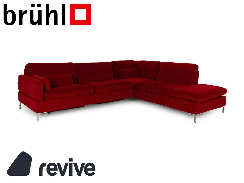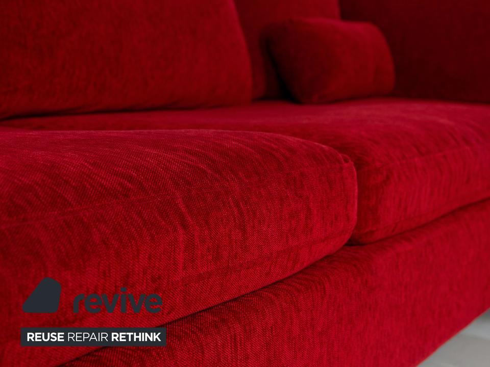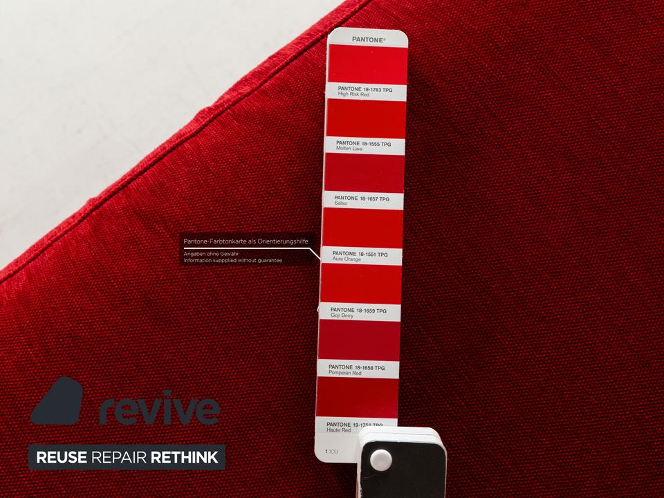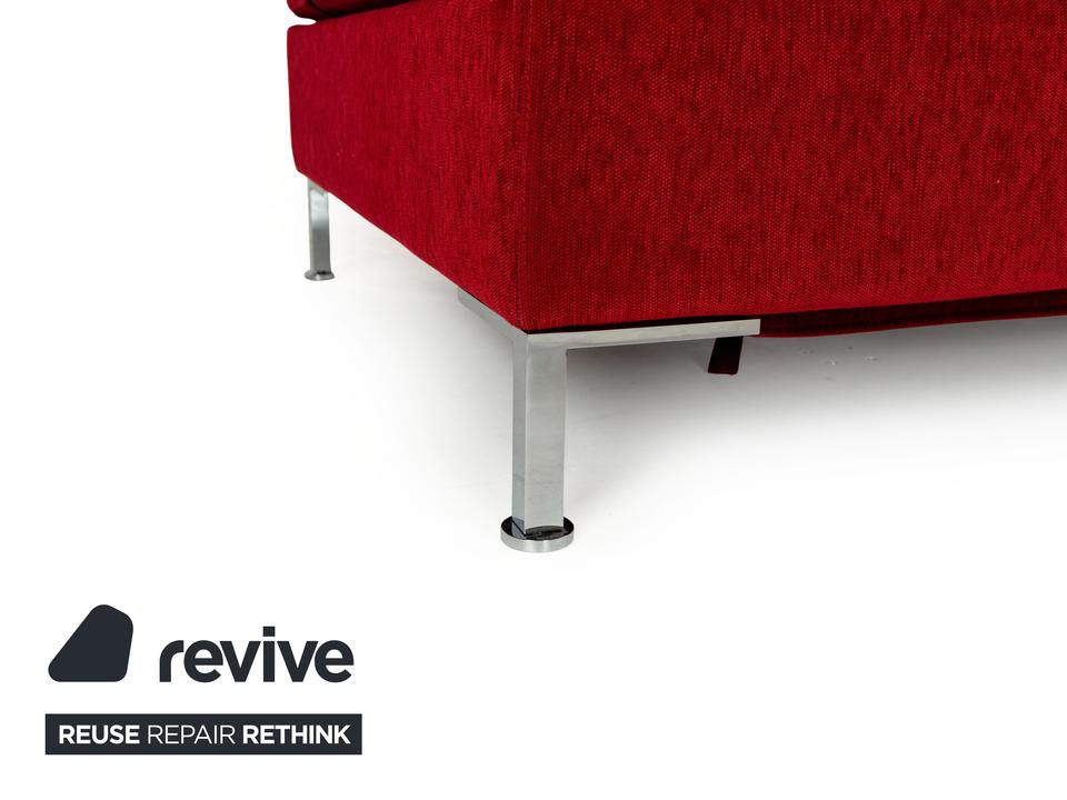 Das Alba Sofa von Brühl ist mit einem roten Stoff bezogen und steht auf Metallfüßen. Es überzeugt mit verschiedenen Verstellmöglichkeiten und einem zeitlosen Design.