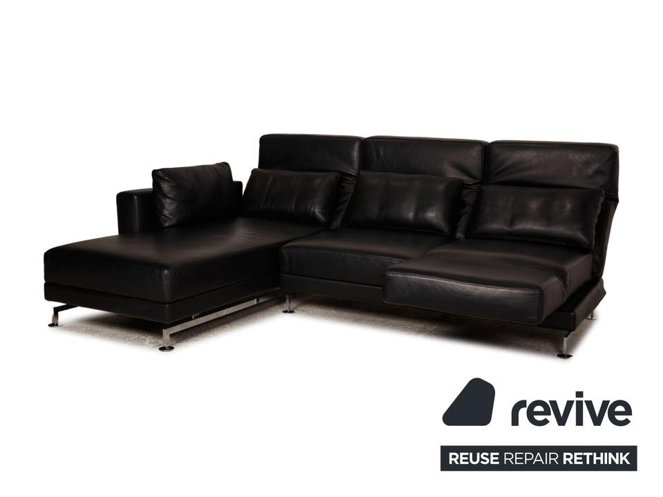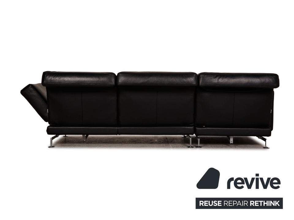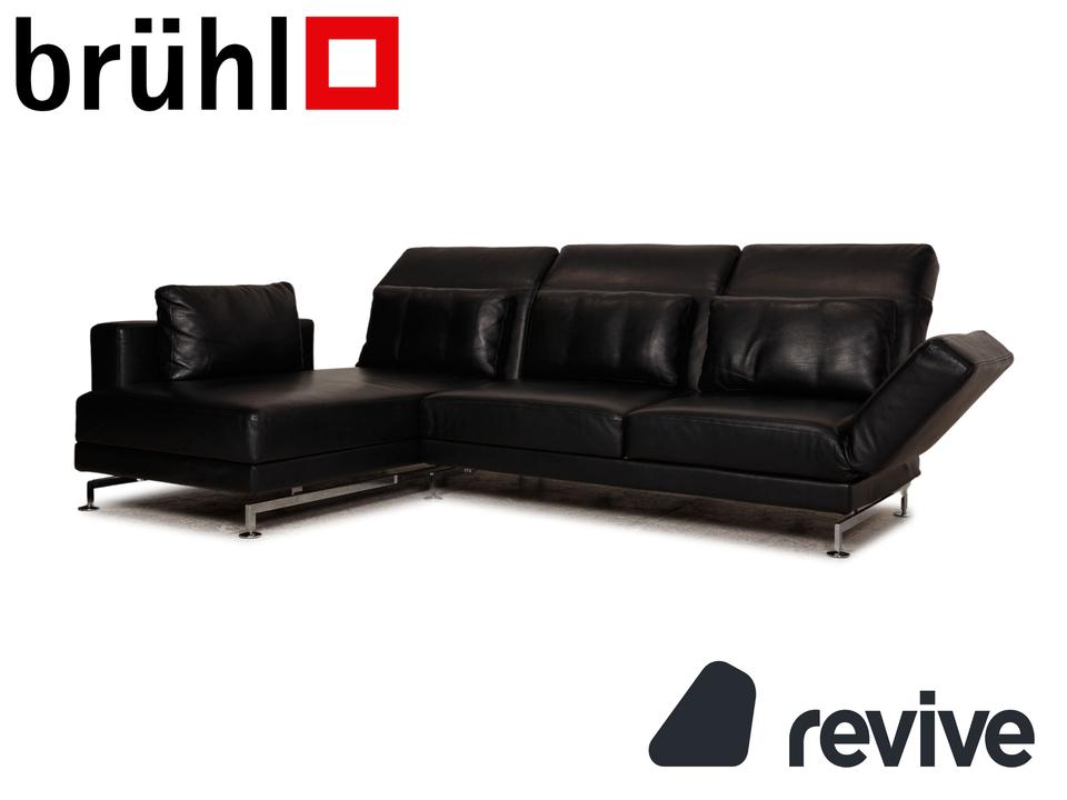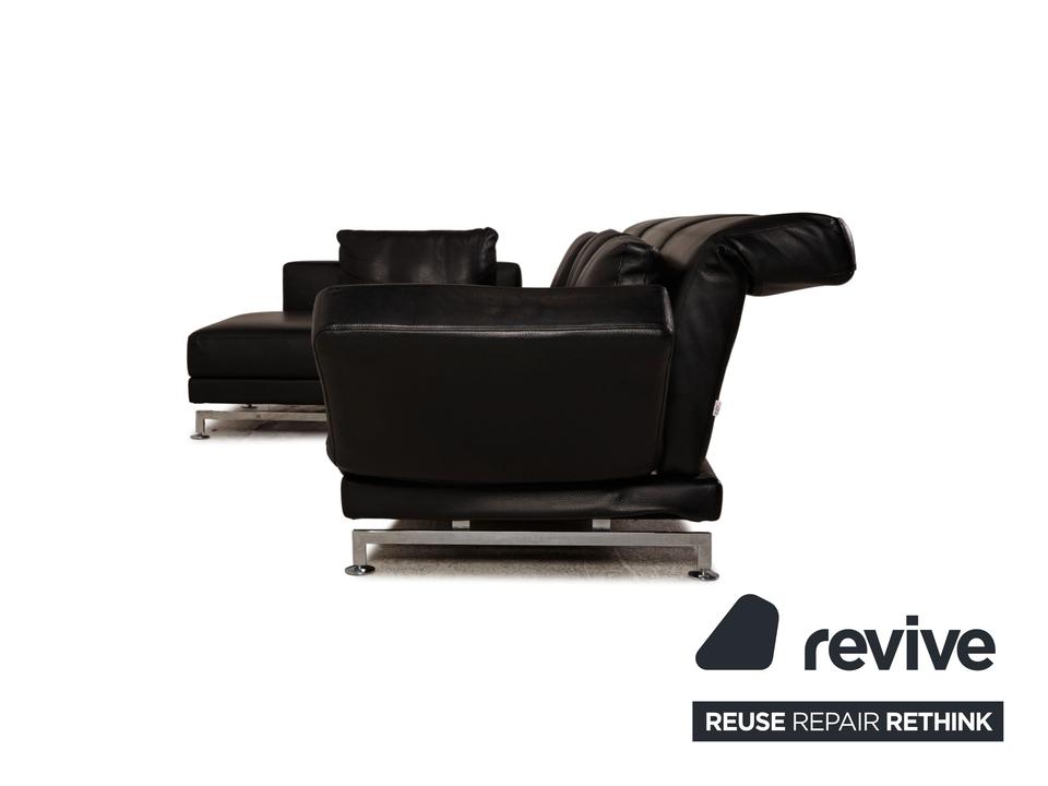 Das Moule Sofa von Brühl ist mit einem schwarzen Echtleder bezogen und steht auf silbernen Metallfüßen. Das zeitlose, klassische Design und die verstellbaren Arm- und Rückenlehnen zeichnen das Ecksofa aus.