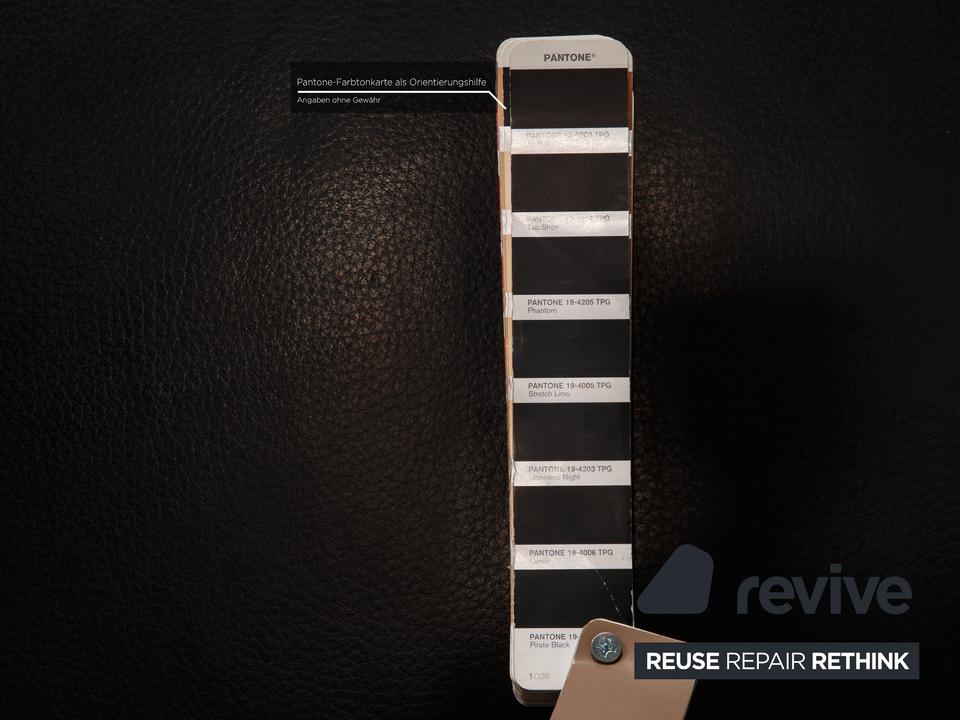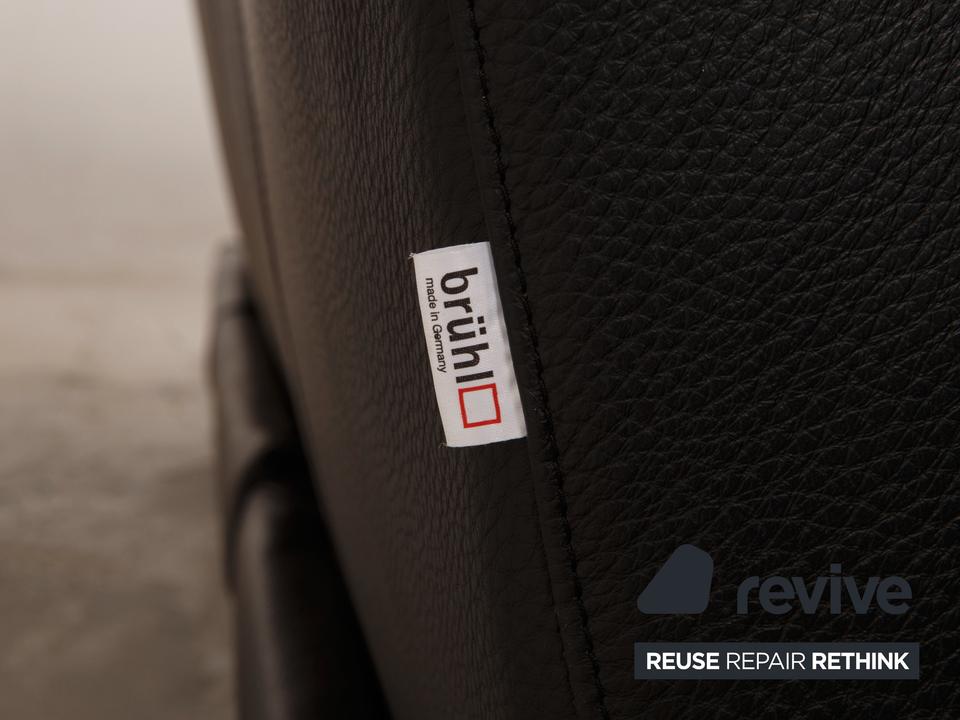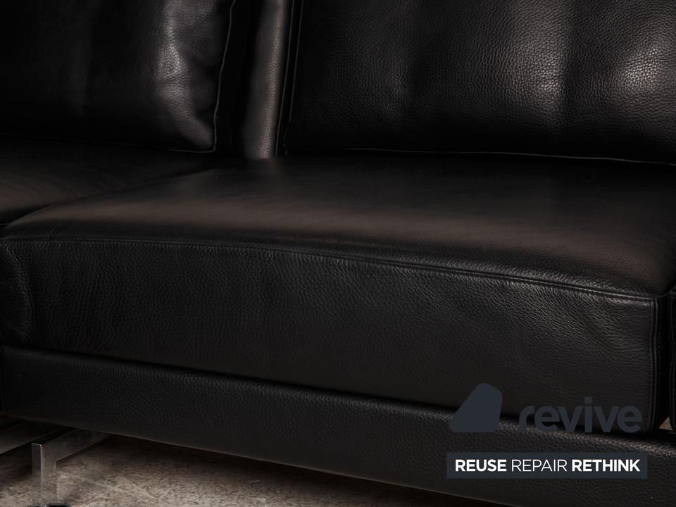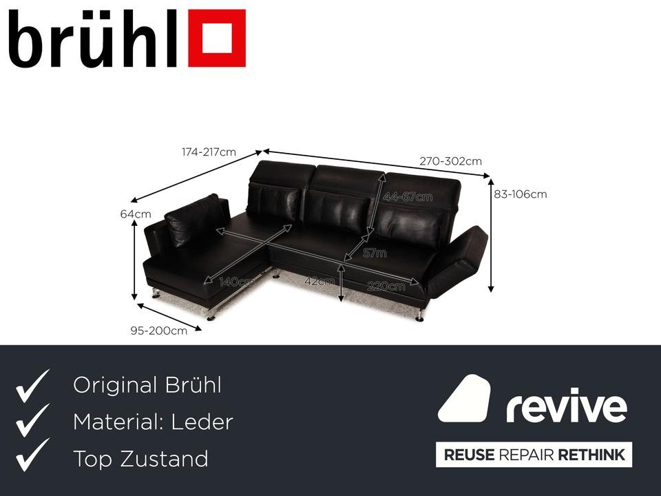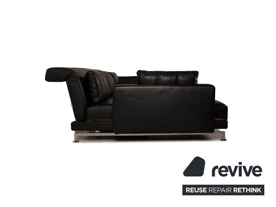Das Moule Sofa von Brühl ist mit einem schwarzen Echtleder bezogen und steht auf silbernen Metallfüßen. Das zeitlose, klassische Design und die verstellbaren Arm- und Rückenlehnen zeichnen das Ecksofa aus.