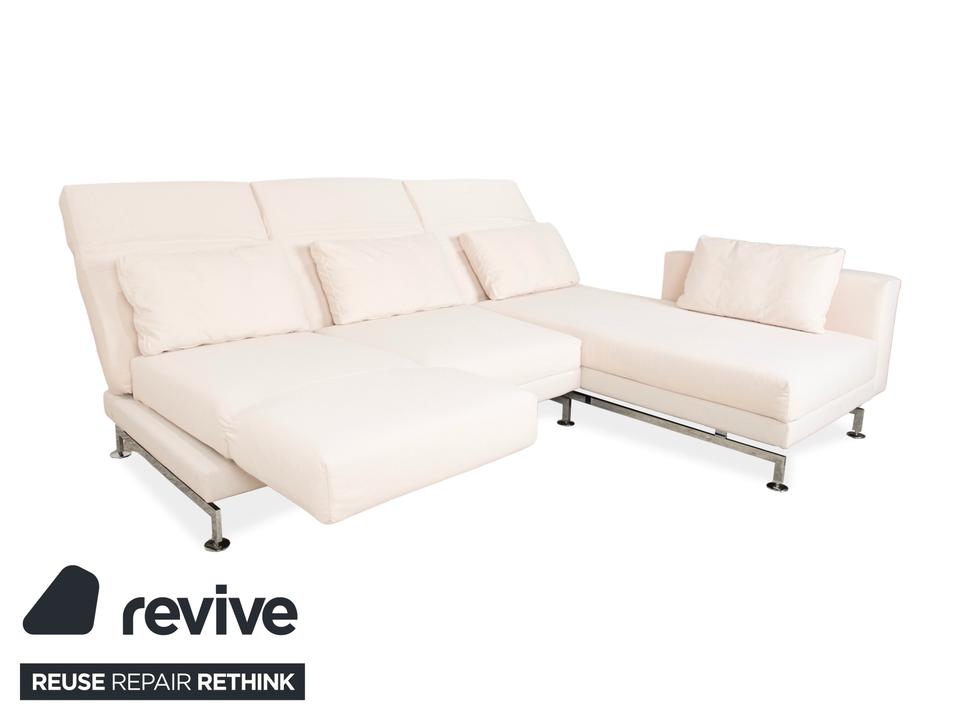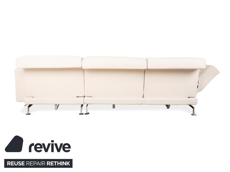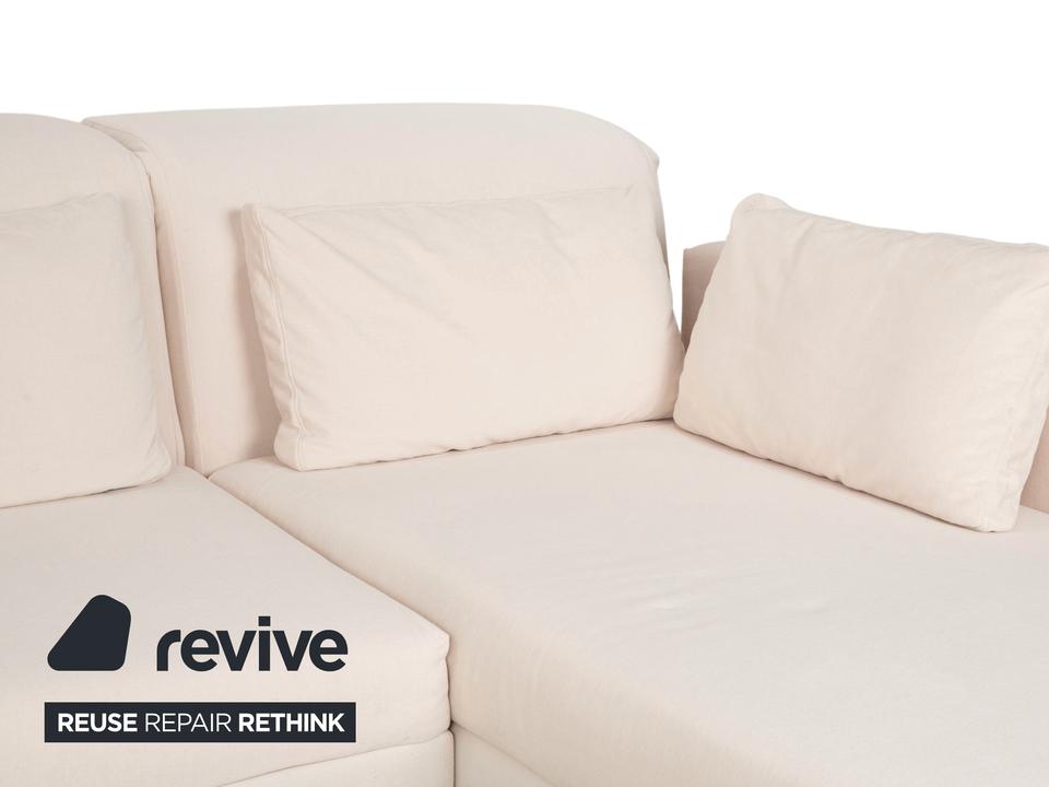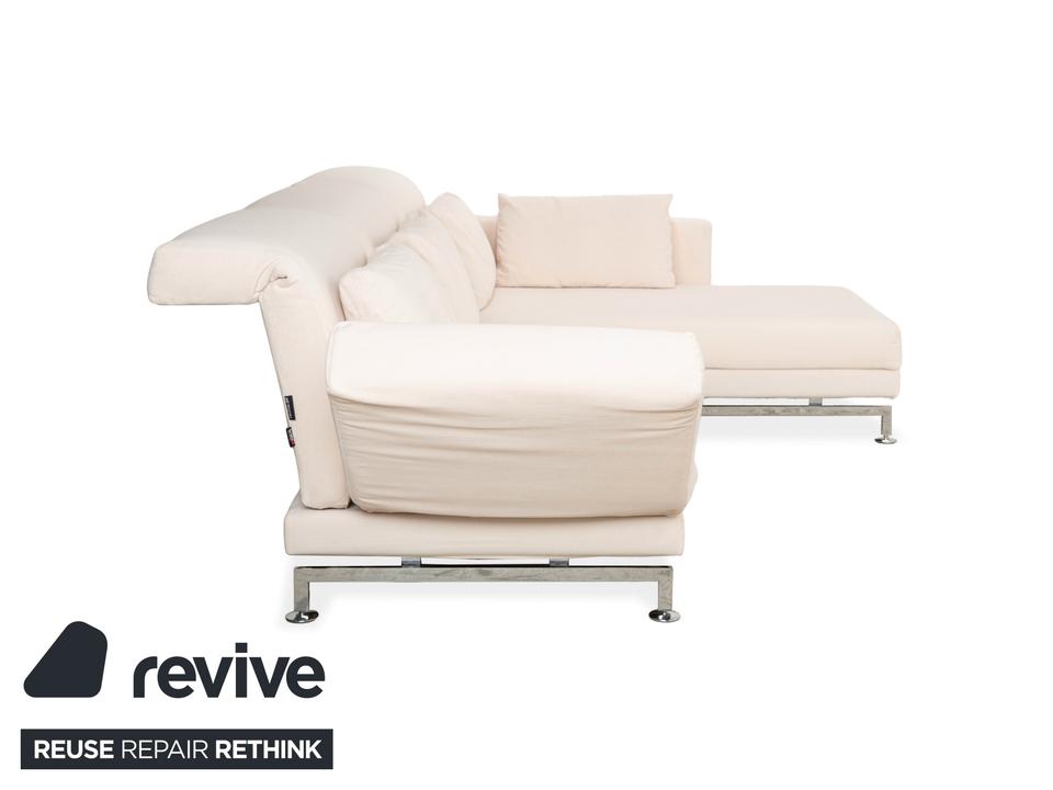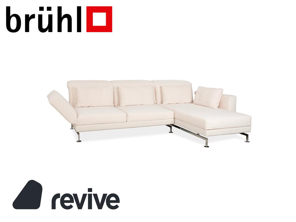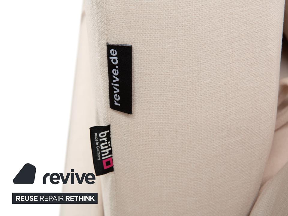 Das Brühl Moule Ecksofa ist mit einem cremfarbenen Stoff (Malou 107 von Höpke) neu bezogen worden. Es ist ein modernes, funktionales Sofa mit einer rechtsseitigen Recamiere. Es bietet hohen Sitzkomfort durch verstellbare Rückenlehnen, Arm- oder Fußlehnen und eine hochwertige Polsterung auf stabilem Metallgestell. Die Rückenlehnen lassen sich absenken, sodass das Sofa gut als Liegefläche genutzt werden kann. Die Füße sind aus verchromtem Metall. Dank seiner klaren Linien und flexiblen Gestaltung passt es sich unterschiedlichen Wohnräumen und Einrichtungsstilen an.