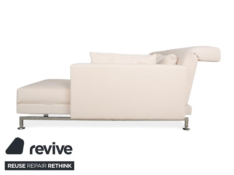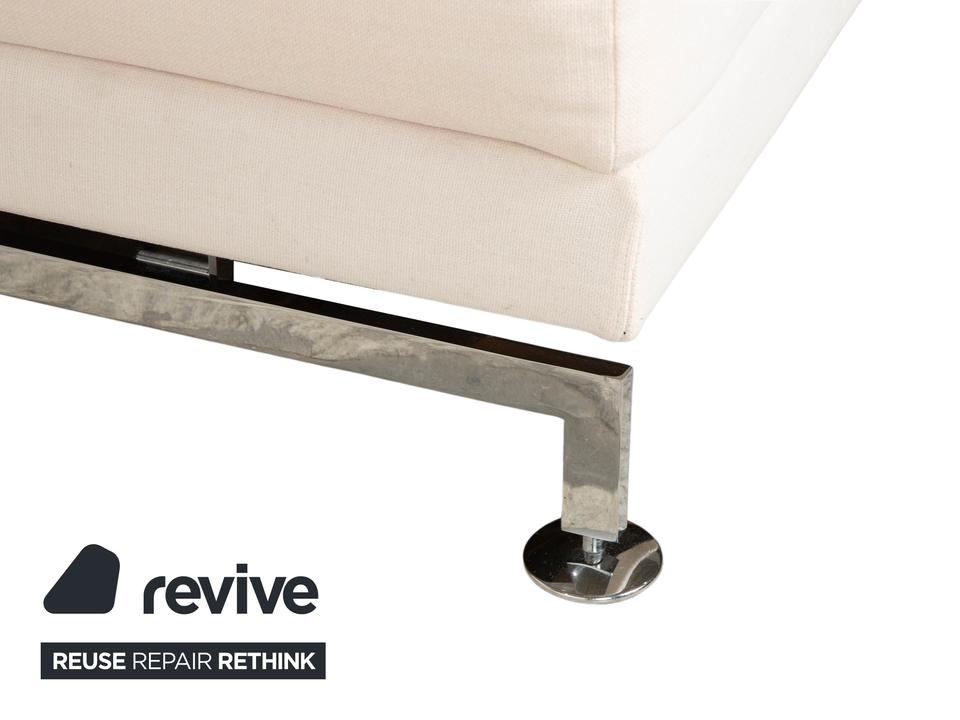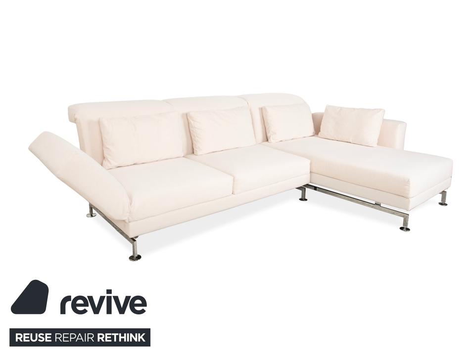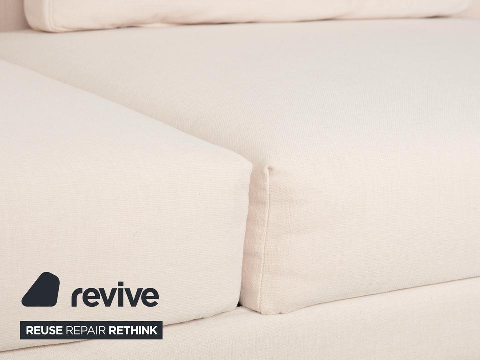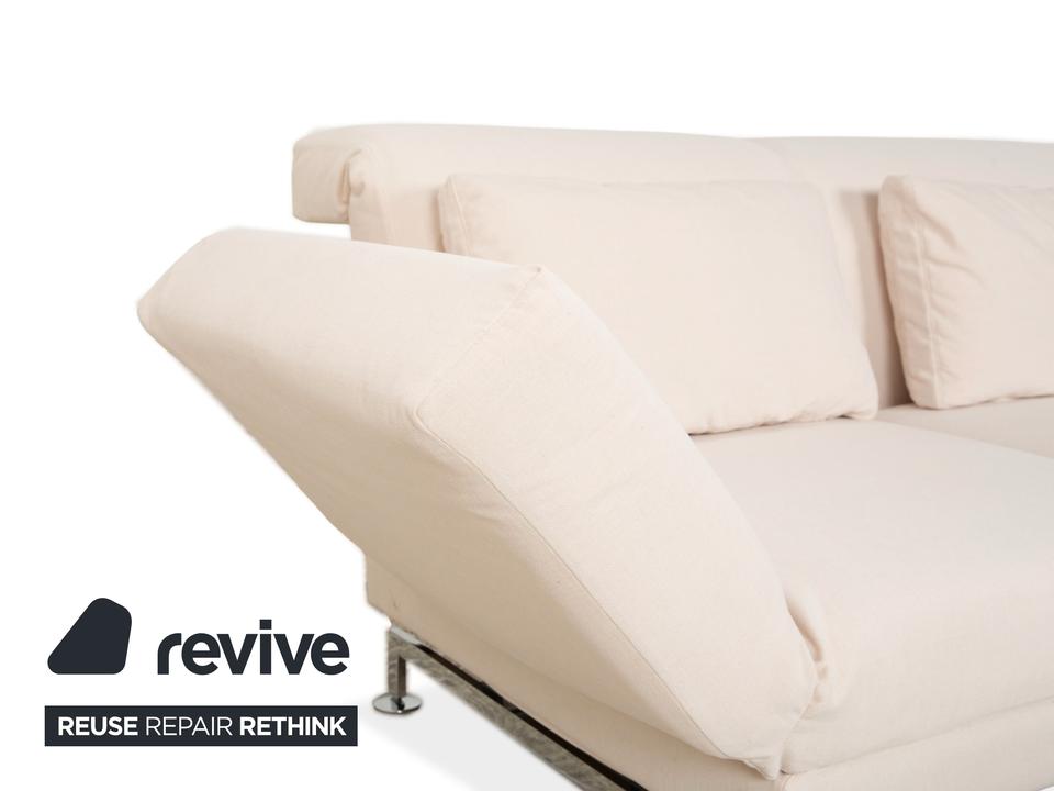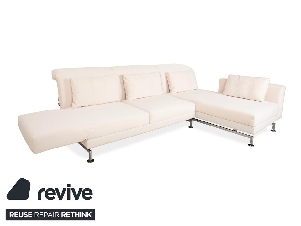 Das Brühl Moule Ecksofa ist mit einem cremfarbenen Stoff (Malou 107 von Höpke) neu bezogen worden. Es ist ein modernes, funktionales Sofa mit einer rechtsseitigen Recamiere. Es bietet hohen Sitzkomfort durch verstellbare Rückenlehnen, Arm- oder Fußlehnen und eine hochwertige Polsterung auf stabilem Metallgestell. Die Rückenlehnen lassen sich absenken, sodass das Sofa gut als Liegefläche genutzt werden kann. Die Füße sind aus verchromtem Metall. Dank seiner klaren Linien und flexiblen Gestaltung passt es sich unterschiedlichen Wohnräumen und Einrichtungsstilen an.