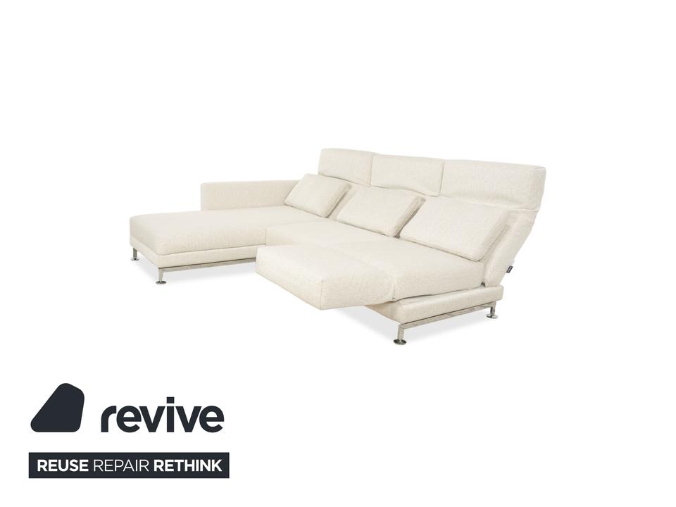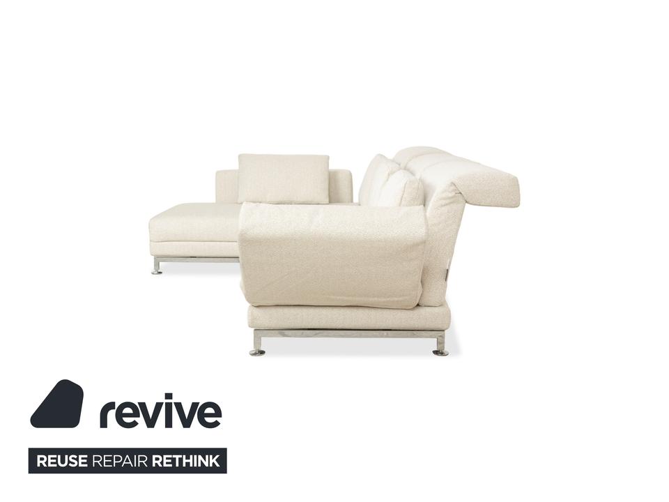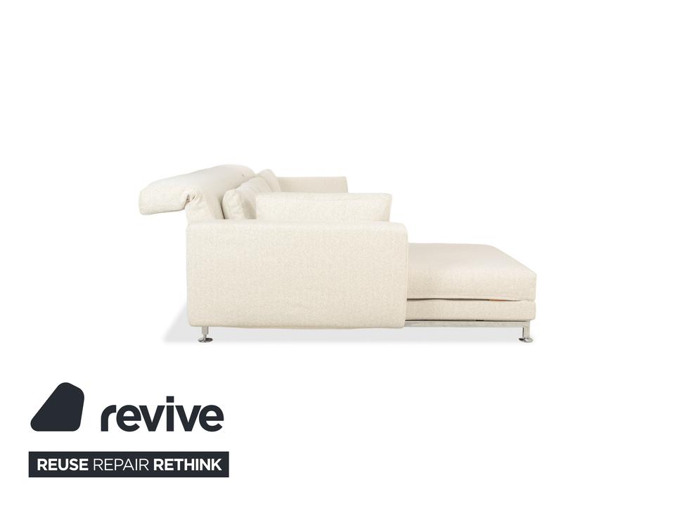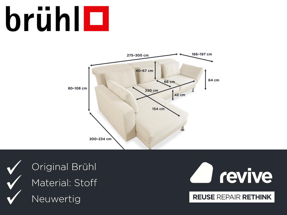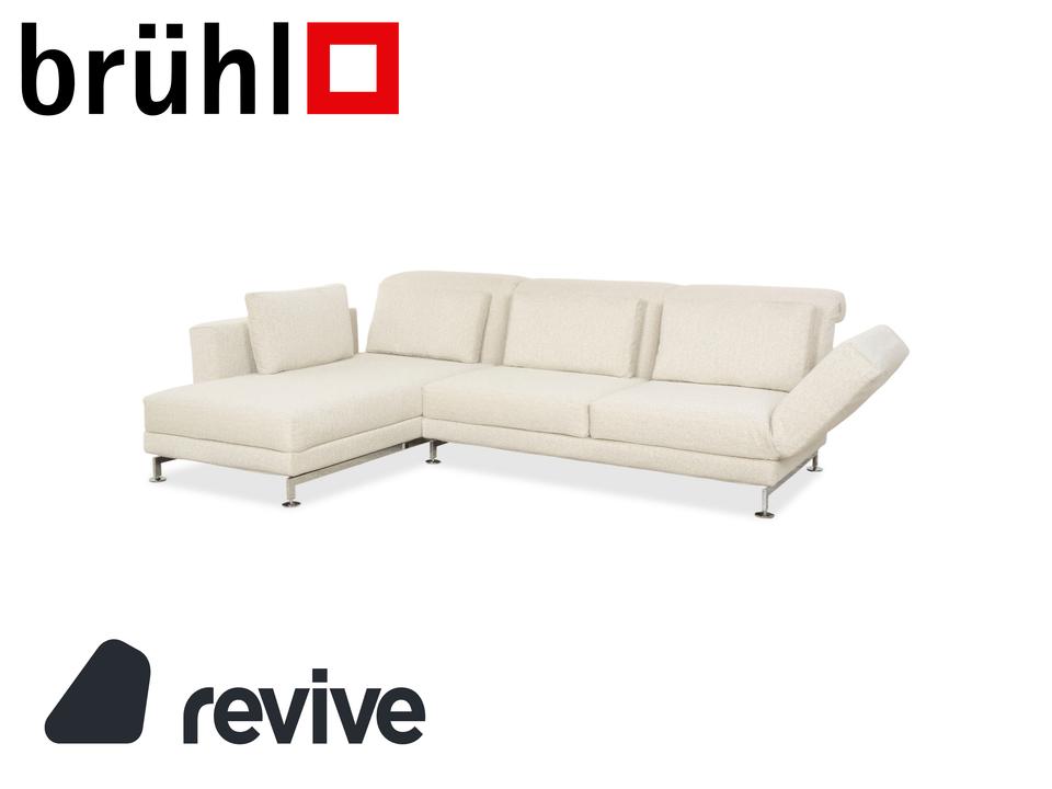 Das Brühl Moule Ecksofa überzeugt durch modernes Design, flexible Funktionalität und höchsten Komfort. Es wurde mit einem weißen Stoff neu bezogen und präsentiert sich in einem frischen, eleganten Look. Die linksseitige Recamiere lädt zum Entspannen ein und bietet gemeinsam mit den verstellbaren Rücken-, Arm- und Fußlehnen vielfältige Möglichkeiten zum Sitzen und Liegen. Die hochwertige Polsterung auf einem stabilen Metallgestell sorgt für optimalen Halt und langanhaltenden Komfort. Durch das Absenken der Rückenlehnen lässt sich das Sofa im Handumdrehen in eine großzügige Liegefläche verwandeln. Verchromte Metallfüße verleihen dem Möbelstück einen modernen Akzent. Mit seiner klaren Formensprache und der anpassungsfähigen Gestaltung fügt sich das Brühl Moule Ecksofa harmonisch in verschiedenste Wohnräume und Einrichtungsstile ein.