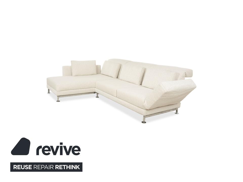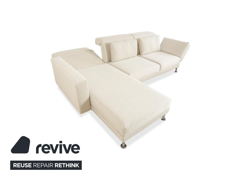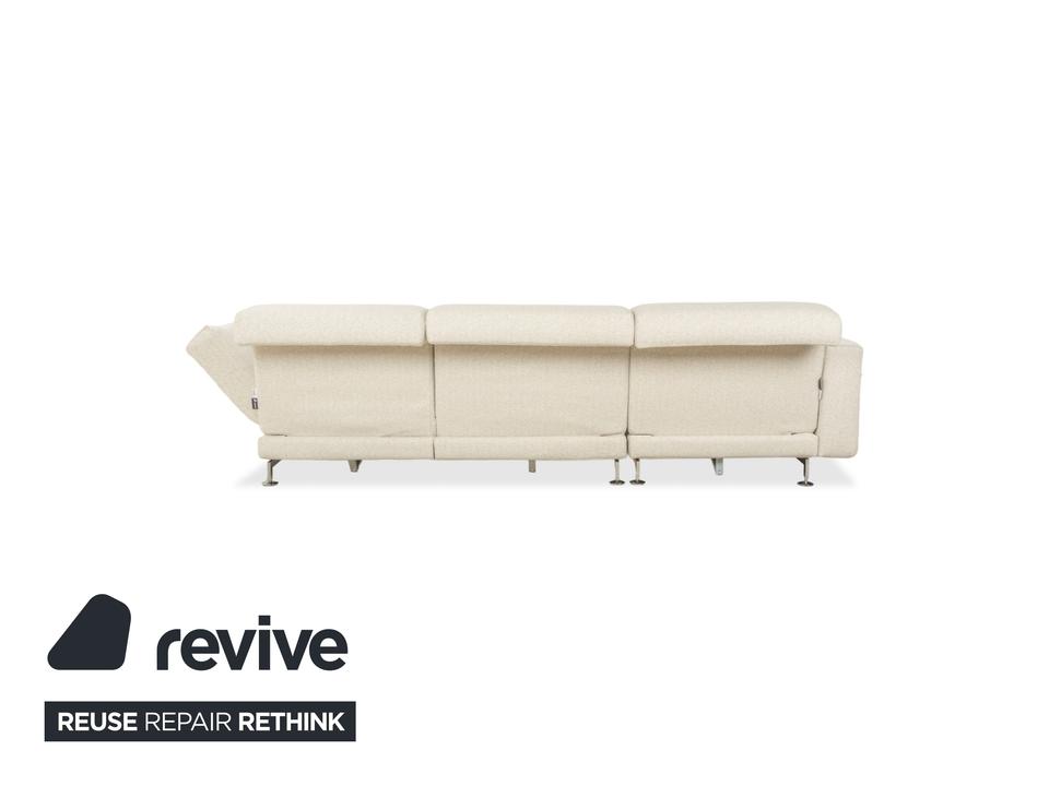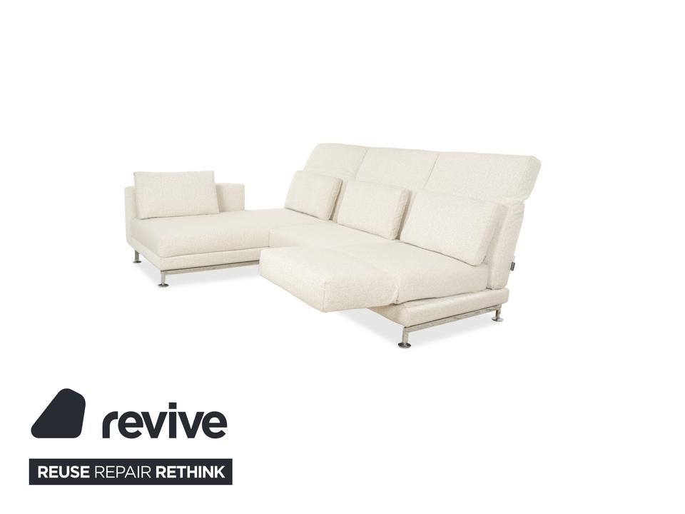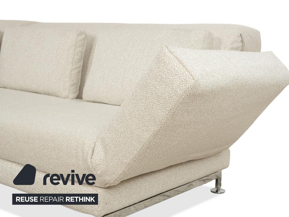 Das Brühl Moule Ecksofa überzeugt durch modernes Design, flexible Funktionalität und höchsten Komfort. Es wurde mit einem weißen Stoff neu bezogen und präsentiert sich in einem frischen, eleganten Look. Die linksseitige Recamiere lädt zum Entspannen ein und bietet gemeinsam mit den verstellbaren Rücken-, Arm- und Fußlehnen vielfältige Möglichkeiten zum Sitzen und Liegen. Die hochwertige Polsterung auf einem stabilen Metallgestell sorgt für optimalen Halt und langanhaltenden Komfort. Durch das Absenken der Rückenlehnen lässt sich das Sofa im Handumdrehen in eine großzügige Liegefläche verwandeln. Verchromte Metallfüße verleihen dem Möbelstück einen modernen Akzent. Mit seiner klaren Formensprache und der anpassungsfähigen Gestaltung fügt sich das Brühl Moule Ecksofa harmonisch in verschiedenste Wohnräume und Einrichtungsstile ein.