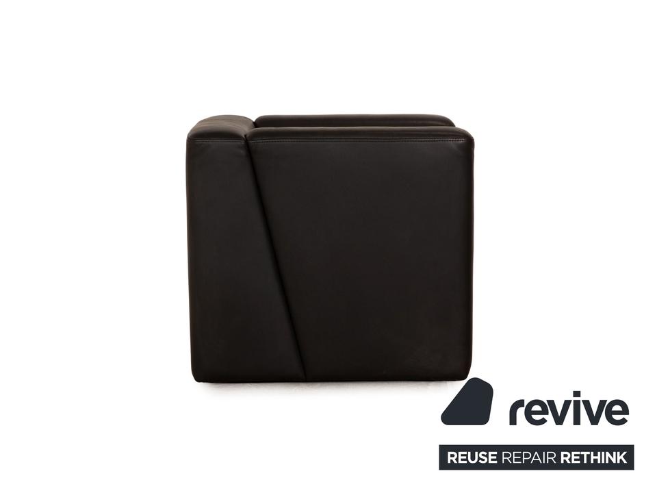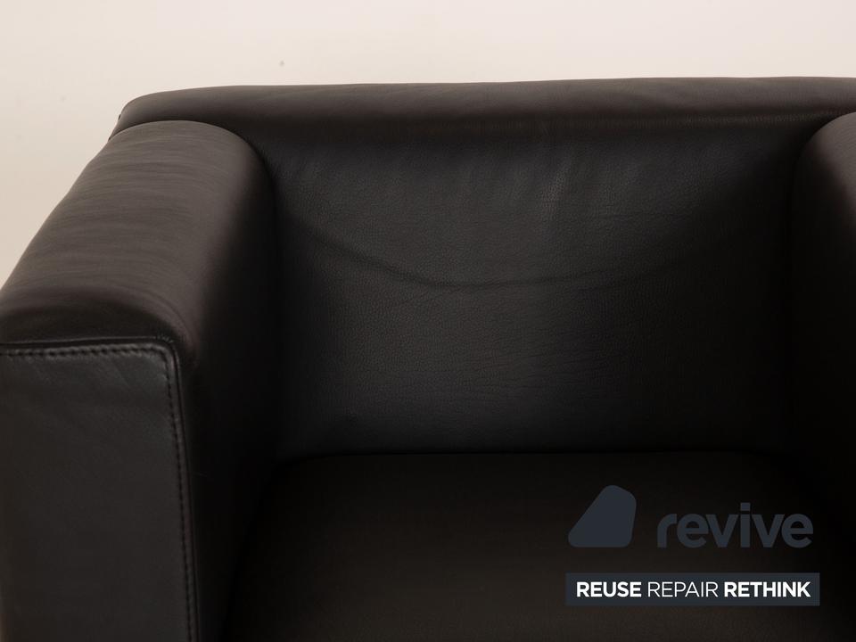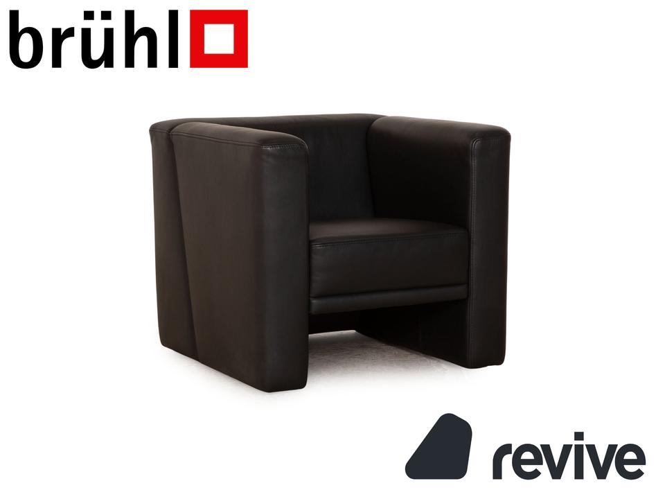 Der Visavis Sessel von Brühl ist mit einem schwarzen Echtleder bezogen und steht auf bodentiefen Seitenteilen. Das minimalistische, zeitlose Design zeichnet ihn aus.