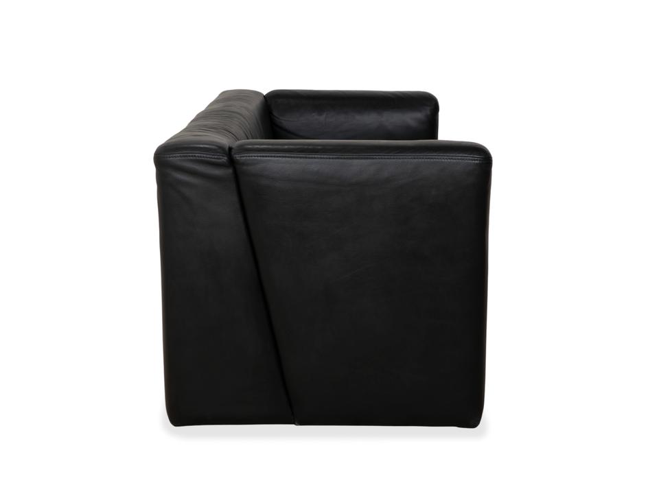 Das Modell „Visavis“ von Brühl ist ein Möbelstück, das sofort auffällt, weil es mit den gängigen Sehgewohnheiten bricht. Statt auf vier klassischen Füßen zu stehen, ruht dieser Zweisitzer auf massiven, lederbezogenen Wangen, die nahtlos in die Seitenteile übergehen. Das verleiht dem Sofa eine unglaublich satte, fast architektonische Präsenz im Raum – es wirkt wie aus einem Block gemeißelt, aber dabei wunderbar weich.Das schwarze Leder unterstreicht diesen skulpturalen Charakter, ist aber haptisch sehr angenehm und einladend. Ein tolles Detail sind die kissenartigen Polster auf den Armlehnen, die dem strengen Aufbau die Härte nehmen und förmlich zum Anlehnen einladen. Es ist ein kompaktes, charakterstarkes Sofa, das sich perfekt eignet, um einen stilvollen Akzent zu setzen, ohne dabei auf Gemütlichkeit zu verzichten. Ein Design-Statement für alle, die das Besondere jenseits des Mainstreams suchen.